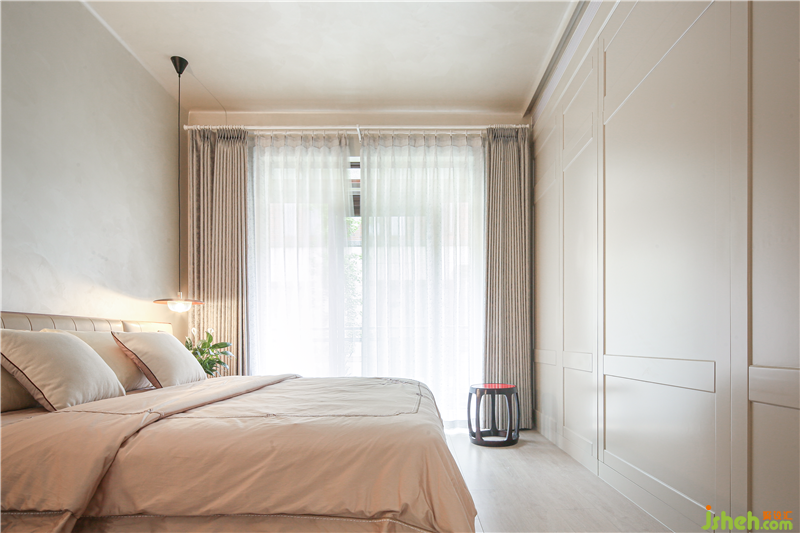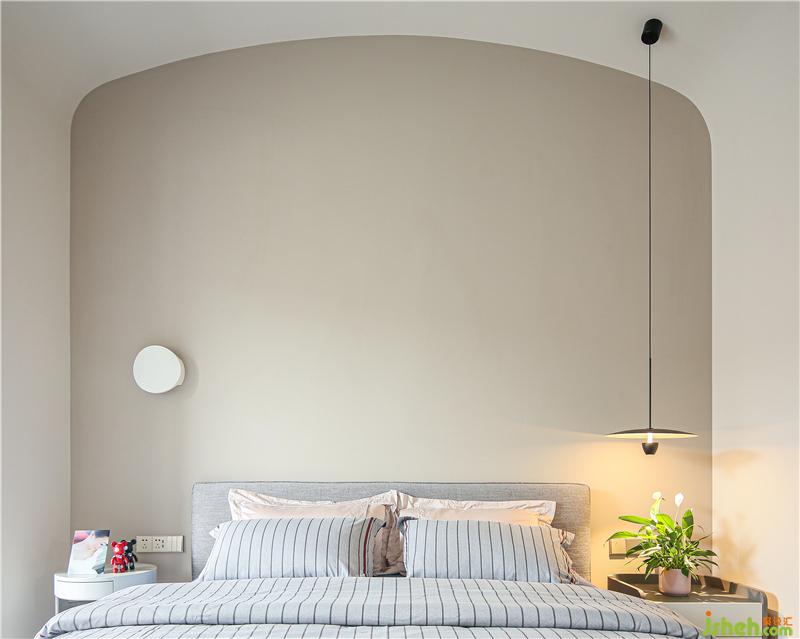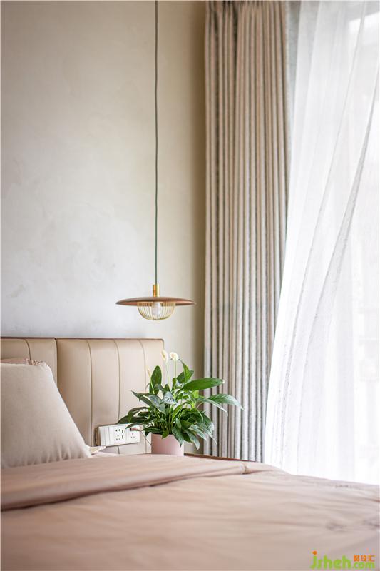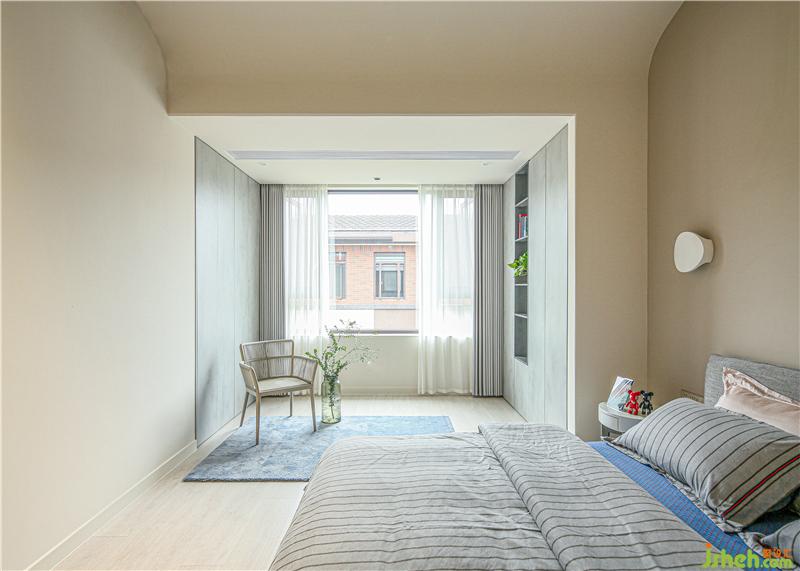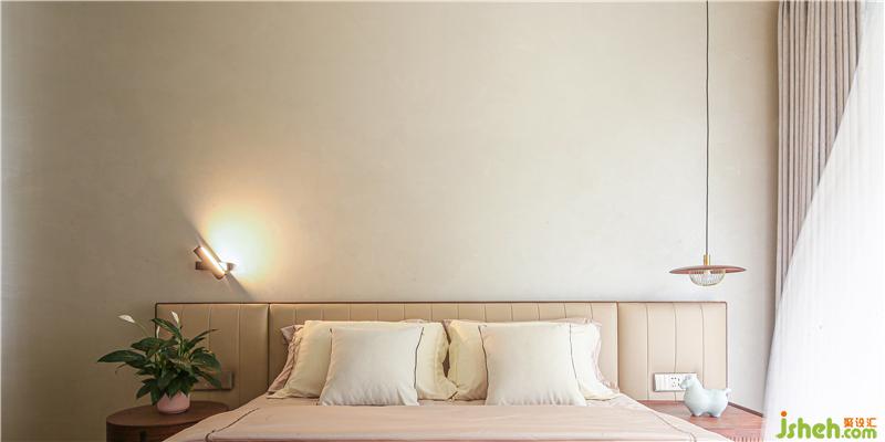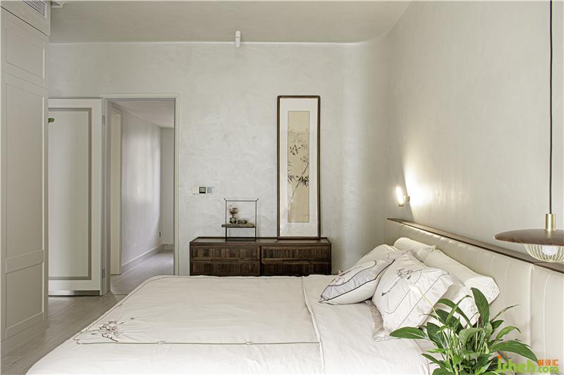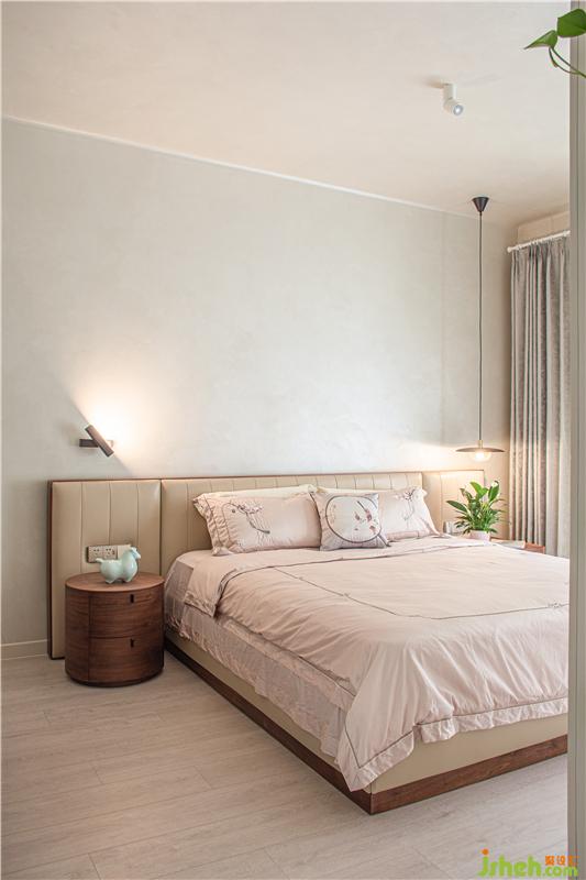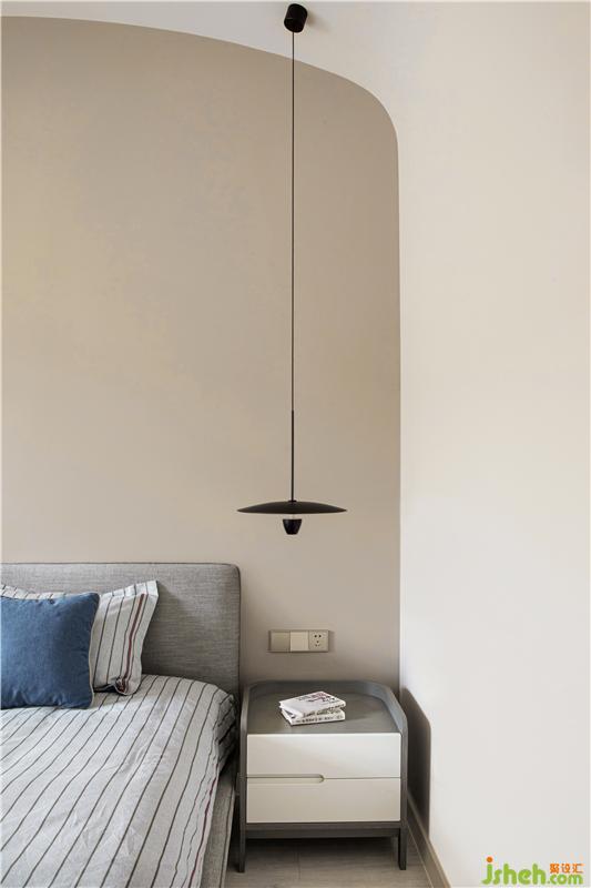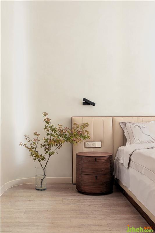 二樓是主臥,整個空間有很多圓弧元素圓弧床緣、圓潤燈盞、古樸小桌,緩和有序去掉尖銳的沖突,似主人緩和友好的生活態(tài)度以及東方飾品,傳遞東方優(yōu)雅大氣以物會人,感知居者性情與愛好