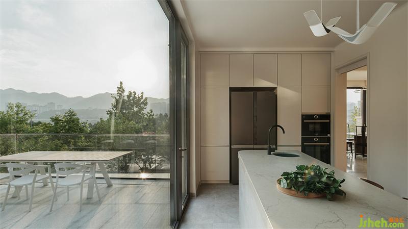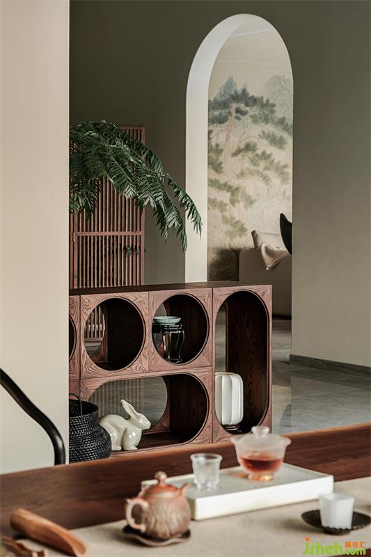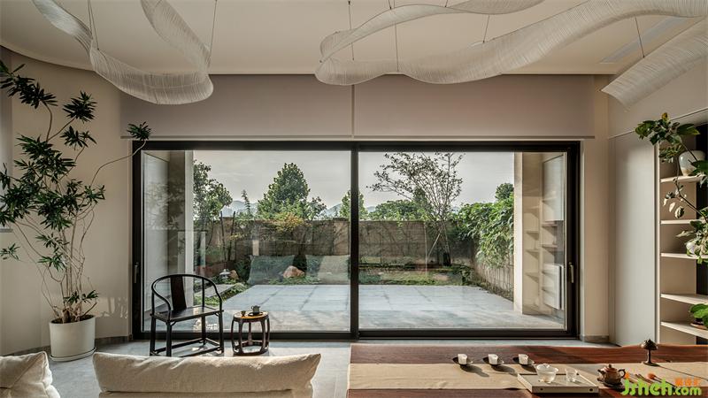茶室的一抹飄帶懸掛空中,搭配沙發(fā)圓椅,營造出柔和、流動之感,與大尺度的門窗,高達(dá)四米的空間高度帶來的力量感形成鮮明對比。原來正如寓言里的北風(fēng)與太陽,溫柔才是愛中不可戰(zhàn)勝的力量。