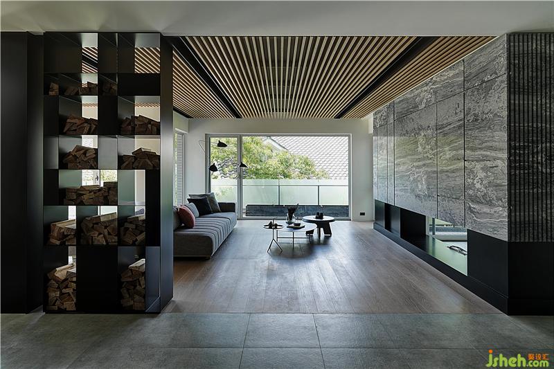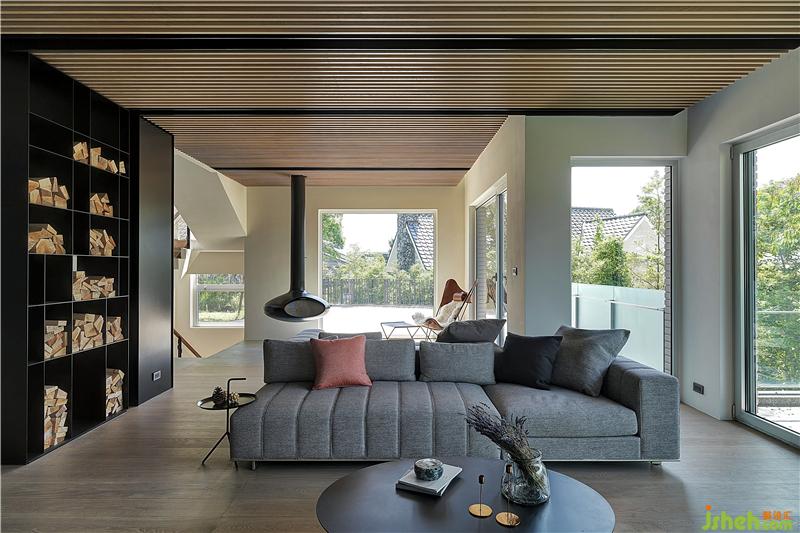 近窗處懸吊一座燒材壁爐,作為空間的溫暖象征,猶如雕塑品般的地佇立于空間之中。