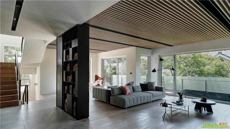 一列黑鐵格柜,定義走道與客廳的分界,亦修飾結(jié)構(gòu)柱,柜體活潑的幾何韻律,賦予視覺(jué)愉悅的通透與律動(dòng)北京裝修設(shè)計(jì)。