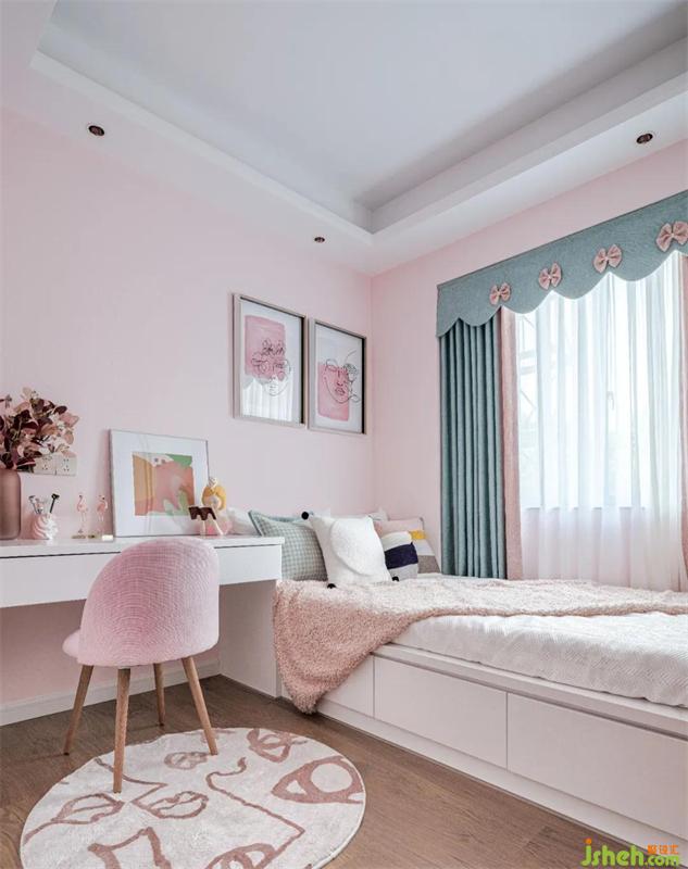 女孩房由馬卡龍色系溫馨且單純的色塊來組成,