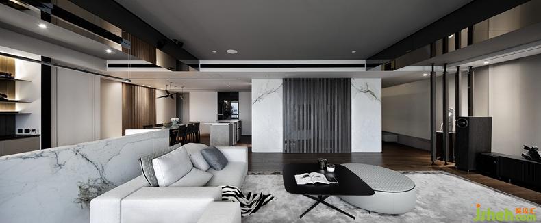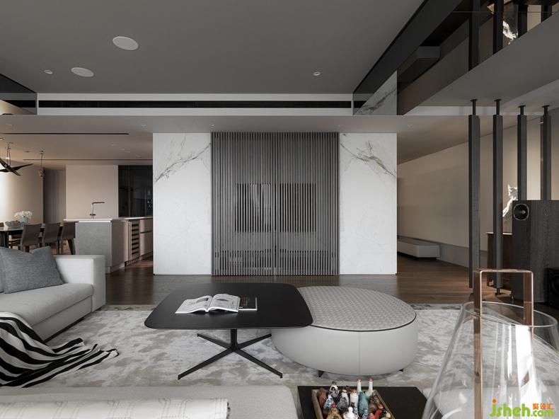 整個公共空間選用大塊面的灰階,以方塊玩轉(zhuǎn)的手法,串起三度介面連續(xù)性的構(gòu)圖與流動感,低彩度佐以義式現(xiàn)代家具的和弦,賦予場域更大的包容力,對居住者而言相對也是零負(fù)擔(dān)的設(shè)計。包括客廳主墻、閱讀區(qū)后靠以及餐廳壓深的端景,都屬于該單元的聚落核心,除了善用木、石類不具侵略性的素材,達(dá)到讓視覺歸零的效果外,也應(yīng)用多種精湛的現(xiàn)代工藝,打造令使用者感受力激增的高質(zhì)感細(xì)節(jié)。
