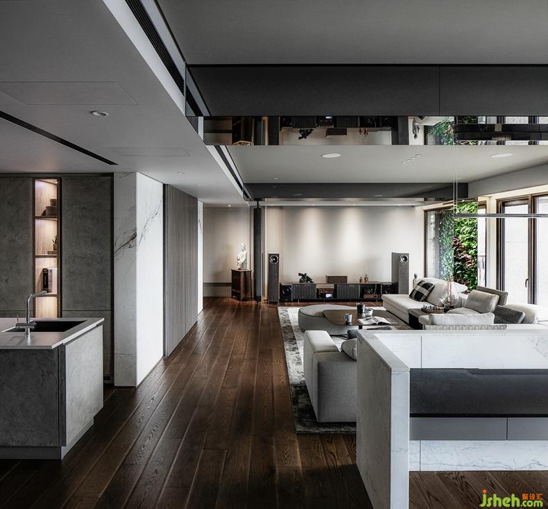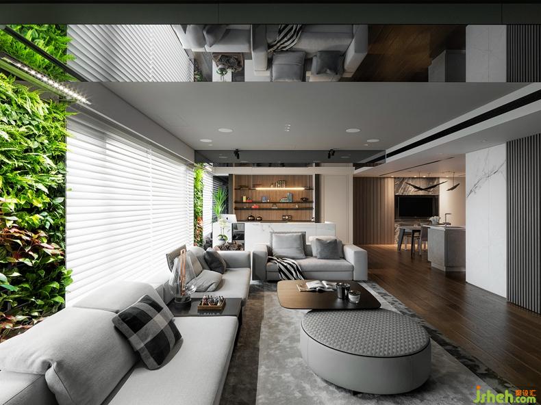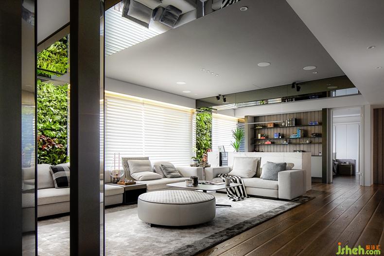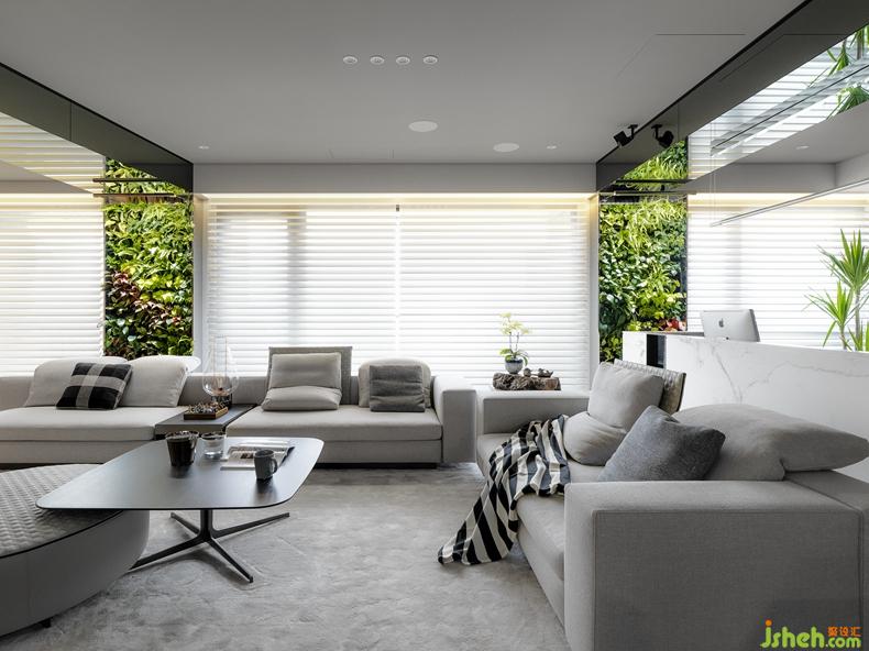 首先在客廳窗與窗間的結(jié)構(gòu)柱位置,大膽導(dǎo)入室內(nèi)植生墻設(shè)計,結(jié)合專利的滴灌系統(tǒng)與照明,帶動居宅內(nèi)全時段進行的活氧光合作用,而在兩列縱向的植生墻上方天頂,依等寬設(shè)置兩座為橫樑的水平向鏡盒,借鏡面倒影創(chuàng)造全視角的室內(nèi)花園意象,目光所至,一天的疲勞跟著煙消云散。