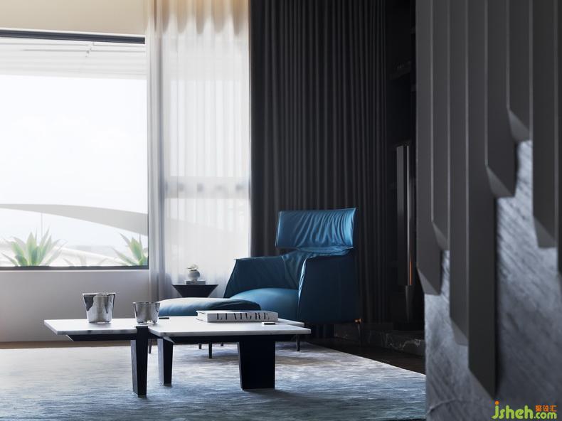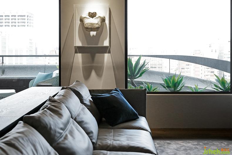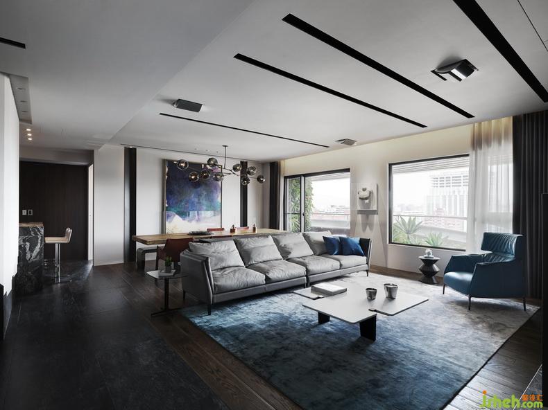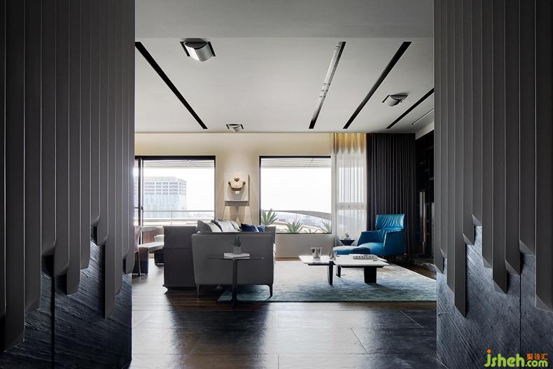 公領(lǐng)域地面使用不同地材作無障礙鋪設(shè),象徵主要?jiǎng)泳€與特定場域分區(qū)??蛷d主墻使用木質(zhì)、黑烤鐵件、鍍鈦金屬與天然石材等異材質(zhì)搭配,著重精致的反差與構(gòu)圖比例。低臺后方并加作玻璃線槽,可將繁雜設(shè)備管線輕松收納。