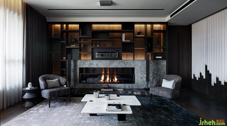 舍棄了電視墻形式,改以石材壁爐搭配書柜墻的完美組合,讓書香漫延全室,時(shí)而聆聽音樂亦可單純閱讀。柜體精算比例并刻意脫開墻面,以襯托柔和背景光的精湛工法,點(diǎn)出厚實(shí)木料與輕薄鐵件格架間鮮明的材質(zhì)反差,下方承接大理石壁爐與低臺,堪稱體現(xiàn)此案主述人文議題的最佳說明。