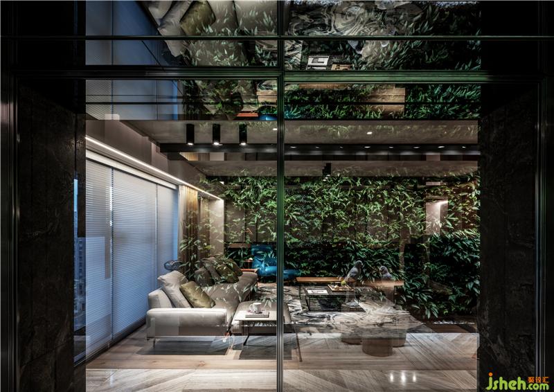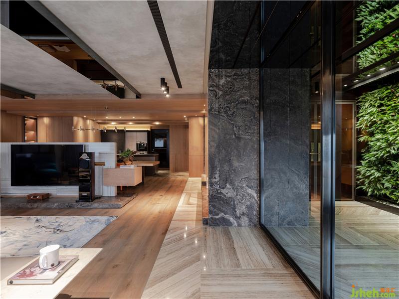 全宅雖擁有三面采光的大戶優(yōu)勢,但進(jìn)門玄關(guān)處卻明顯偏暗,因此我們打造一整面植生墻,營造一回家便如同走入一座森林、大反差的情境驚艷引人入勝,實(shí)作上并搭配灰鏡天花板,加上色溫接近天然光的照明計(jì)畫,一舉突破暗區(qū)限制,成功借凸顯大面植生墻的蓬勃綠意,熱情迎賓也醞釀場域包容力,地坪則選用質(zhì)樸木紋石,精工裁成不同大小、紋理行交丁錯(cuò)拼,于極度和諧舒服的暖調(diào)中,釋放宛如置身大自然的療愈氛圍。裝修公司