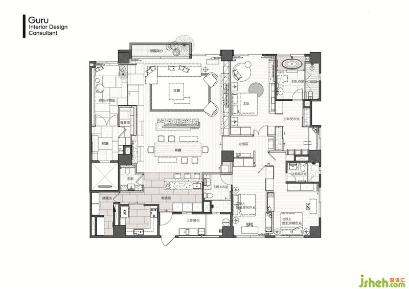 公領(lǐng)域采自由通透、機(jī)能獨(dú)立、景深共享的聚落式規(guī)劃,并活用多重異材質(zhì)混搭、組接工藝,同步完成場(chǎng)域機(jī)能分區(qū)與豐富空間層次、獨(dú)創(chuàng)優(yōu)質(zhì)生活觀等多重目的!設(shè)計(jì)關(guān)鍵在于分野公私領(lǐng)域的十字動(dòng)線為主,包括中島輕食區(qū)、餐廳長(zhǎng)達(dá)三米八的訂制長(zhǎng)餐桌、電視半墻軸線和客廳長(zhǎng)沙發(fā)等數(shù)道平行機(jī)能陣列為輔,結(jié)合軟硬量體的操作,精準(zhǔn)分配既有空間,并逐次定義客廳、餐廳、輕食吧臺(tái)區(qū)等多個(gè)機(jī)能單元,其中長(zhǎng)餐桌堪稱公領(lǐng)域機(jī)能核心,家庭成員間日常作息的休閑互動(dòng),基本上都聚合在此區(qū)進(jìn)行,但即使人員散布于周邊其他單元,也不影響全案預(yù)先設(shè)定的景深共享、機(jī)能互補(bǔ)、樂(lè)趣情調(diào)倍增等人文特質(zhì)。