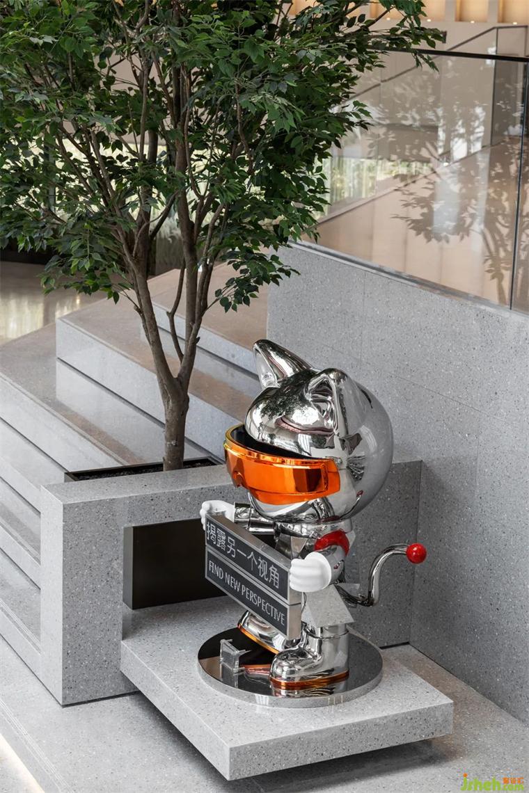 盒子櫥窗處有只萌趣的精靈——月球科技金貓,它略顯恬靜的姿態(tài)顯得尤其美好,一派沉思的模樣讓人不由得跟著一起思索起來。裝修設(shè)計將其與月球的形象相關(guān)聯(lián),不僅僅是天馬行空的想象,更是對生活的無限期許,月球讓我們的思緒飄遠(yuǎn),柔和的月光更讓我們沉靜下來,放慢腳步駐足思考本心,尋找內(nèi)心深處治愈的能量。