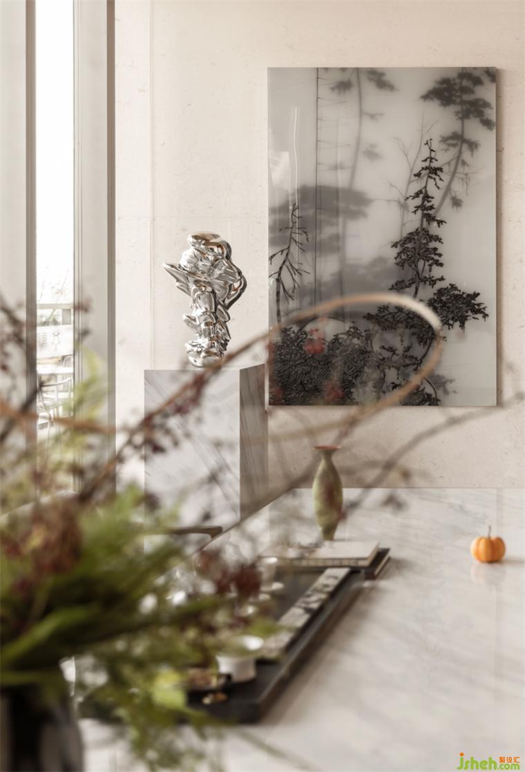 會(huì)議室的藍(lán)色躍入眼簾,為空間帶來了生動(dòng)性,雅致花器與質(zhì)樸小鹿擺件,售樓處設(shè)計(jì)簡單的器物便為空間增添了藝術(shù)性的表達(dá)??臻g器物與陳設(shè)滿足會(huì)議交談實(shí)際需要,在實(shí)現(xiàn)空間功能性建構(gòu)的同時(shí),不失卻人與人之間交談的溫度。