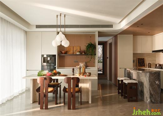 餐廳最具生活的煙火氣息。一日三餐,皆為生活的本真,除卻浮華的表象,在生活中最為重要的便是家人與朋友的陪伴。開(kāi)放式的廚房搭配天然紋理大理石島臺(tái),樣板房設(shè)計(jì)獨(dú)特而美觀,且提升了整個(gè)廚房的品質(zhì)感與設(shè)計(jì)感。