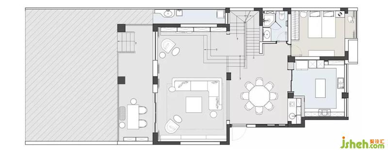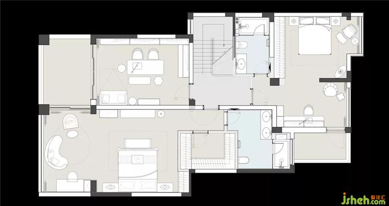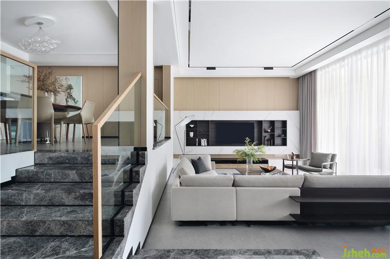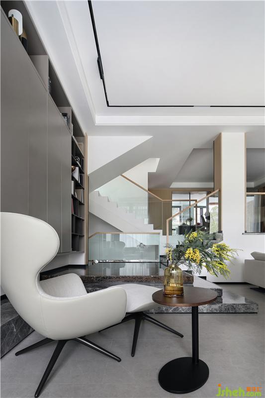 為了兼顧負(fù)一樓下沉空間的高度,我們在一樓休閑廳的書柜處做了整體抬高的平臺(tái),使之與負(fù)一樓的樓梯間一起,形成更為錯(cuò)落有致的空間層次感。