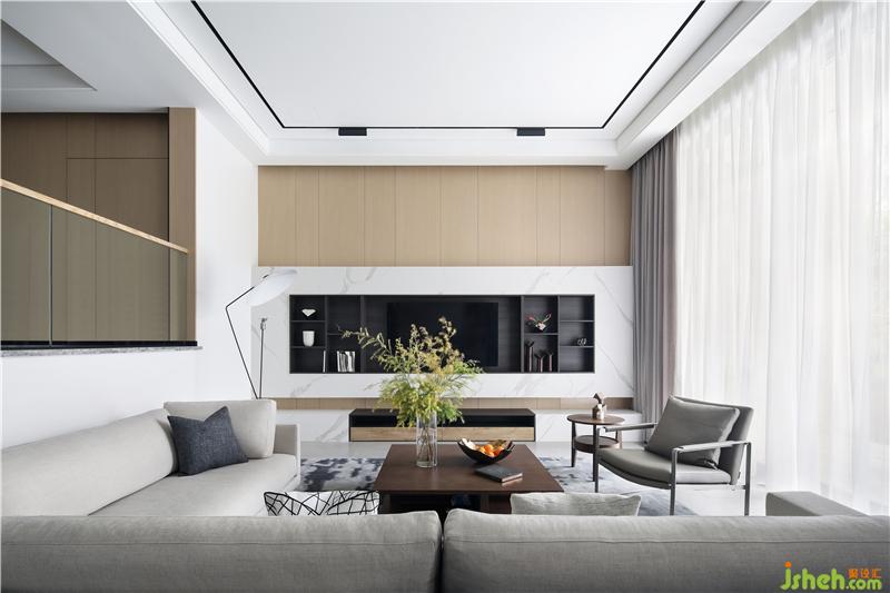 客廳以低調(diào)內(nèi)斂的灰色調(diào)為主,結(jié)廬人境,無車馬喧,溫文爾雅。簡約方正的線條勾勒出家具陳設(shè)的清朗俊逸,富于幾何的理性魅力。