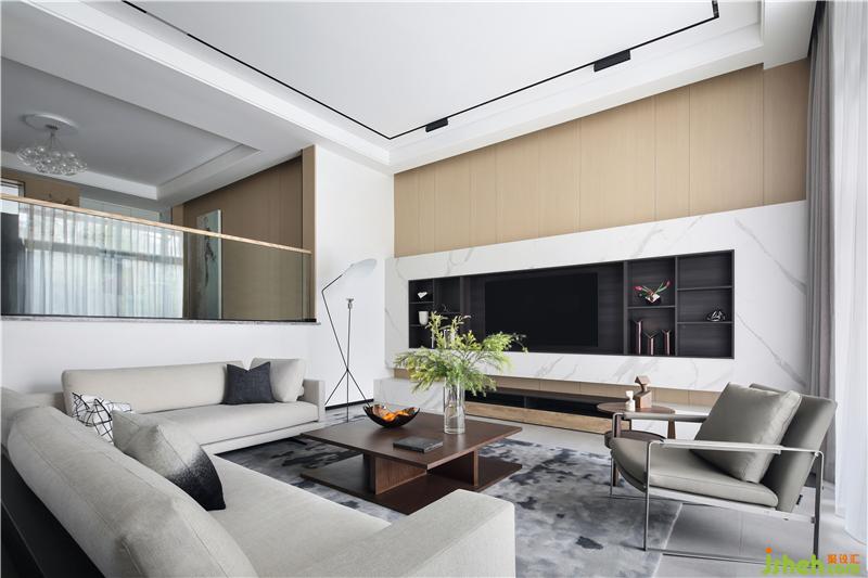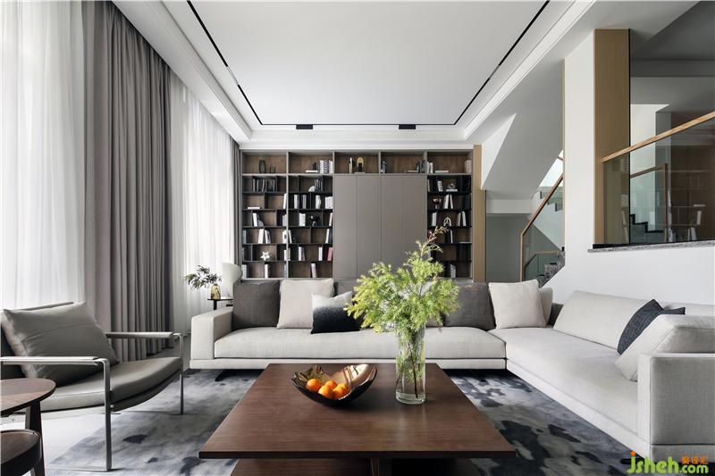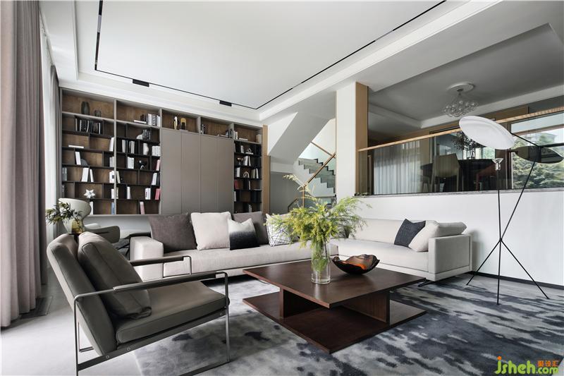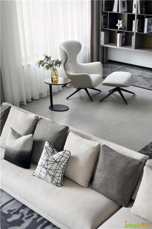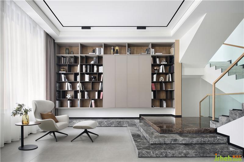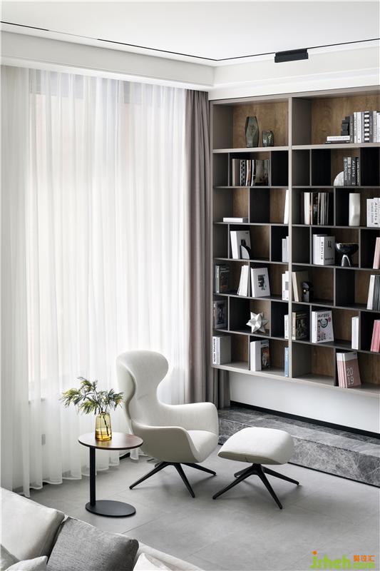休閑廳為客廳的補充空間,位于樓梯平臺旁,沉穩(wěn)質(zhì)感的書柜鋪滿整面墻,如源頭活水般浸潤著整個空間,正是“書卷多情似故人,晨昏憂樂每相親”。