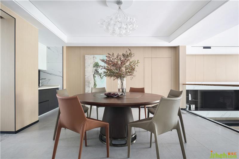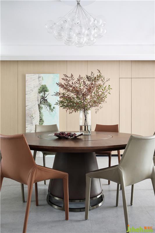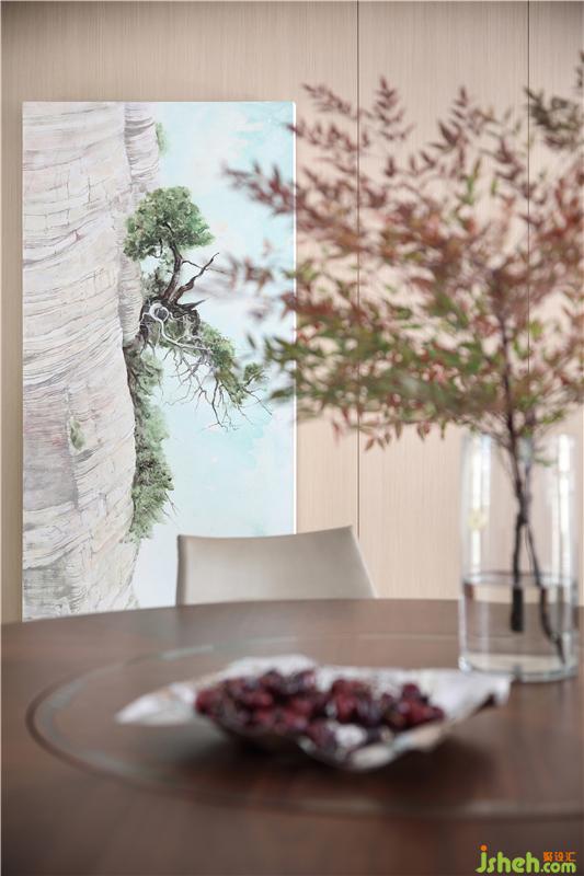 原木材質(zhì)的家具,油畫中遒勁的峭壁蒼松,餐桌上的疏影橫斜的瓶盞,自然質(zhì)樸,在濃淡相宜的雅致中,愈增清新與活力。
