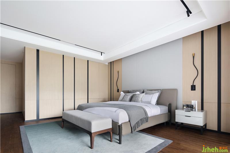 二樓主臥的整面玻璃窗引景入畫,將小區(qū)水景和自家后花園的美景盡收眼底。衣柜做了隱藏處理,讓空間簡凈有序。