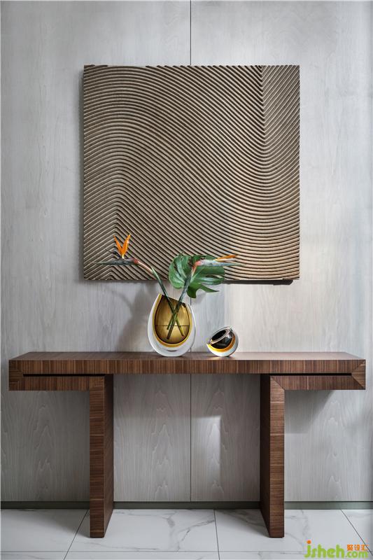 在本項(xiàng)目的空間中,直角折線將冷暖融會(huì)平衡,譜寫出和諧的旋律,使空間形成內(nèi)在統(tǒng)一的渾融秩序。鈍角折線則試圖沖破發(fā)出強(qiáng)音,卻終因內(nèi)質(zhì)的柔和而趨于悠揚(yáng),打破空間和諧秩序的同時(shí),讓空間變得富于潤(rùn)度。當(dāng)今時(shí)代“擬物”審美的催生、極簡(jiǎn)風(fēng)的盛行都離不開人們重新審視自然的眼光。返璞歸真、回到物本身……都不僅僅再是一個(gè)口號(hào),而是空間迫切需要灌注的養(yǎng)分??臻g本身就有著自己的呼吸開闔,一呼一吸,無拘無束,自然而然。 理性嚴(yán)謹(jǐn)?shù)目蛻粝矚g天然的木質(zhì)材質(zhì),沒有現(xiàn)代的奢華感,充滿溫暖。設(shè)計(jì)師因此在空間中運(yùn)用了大量的原木元素:木質(zhì)屏風(fēng)、沙發(fā)底座、臺(tái)燈底座、木質(zhì)樓梯、木質(zhì)版畫、木質(zhì)方幾……無不流露出濃郁的自然雅韻。