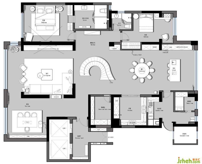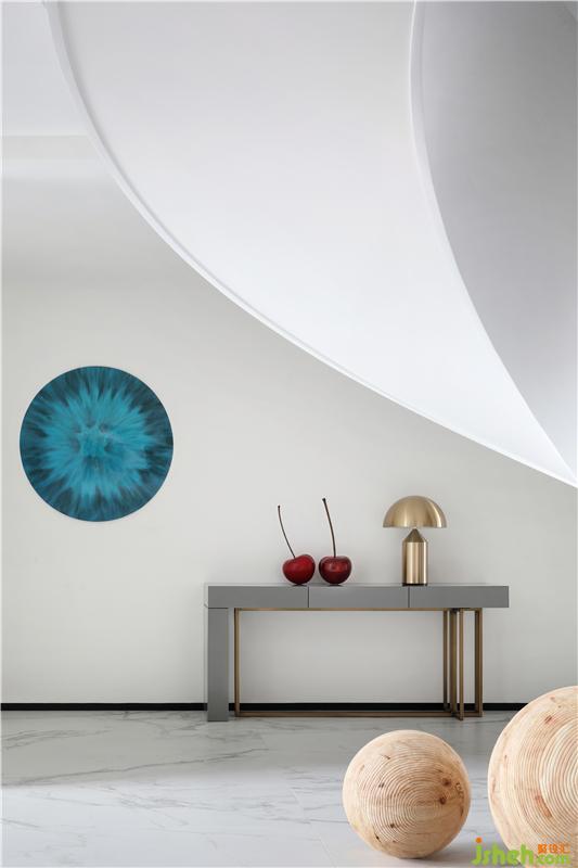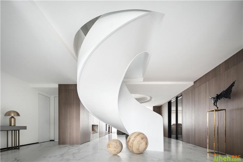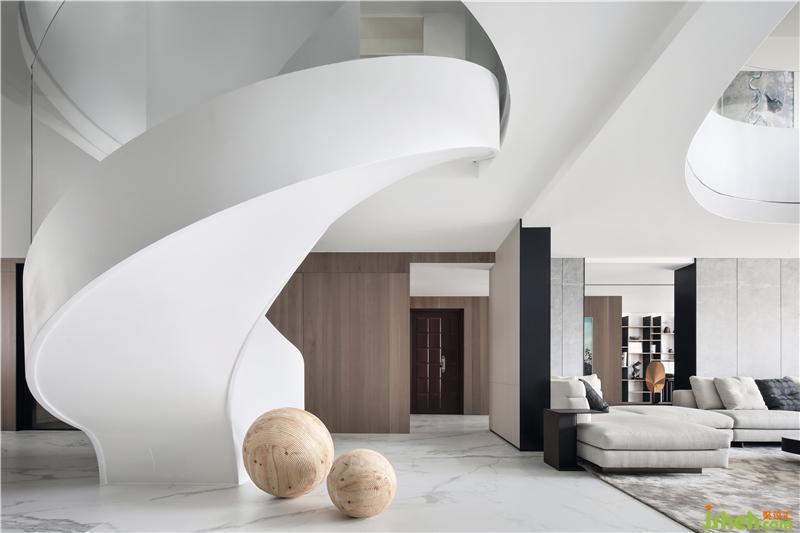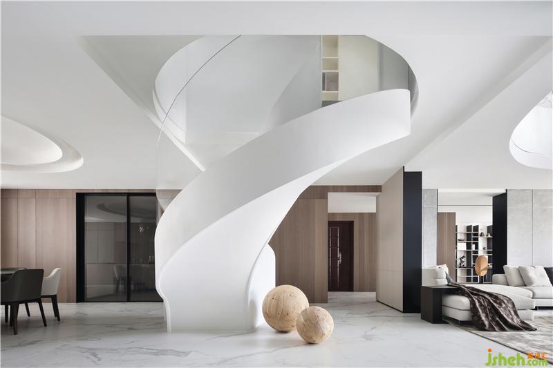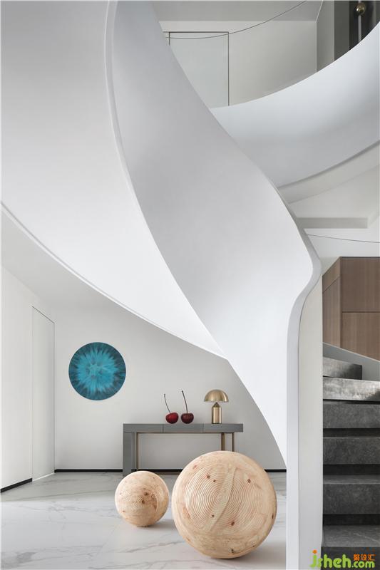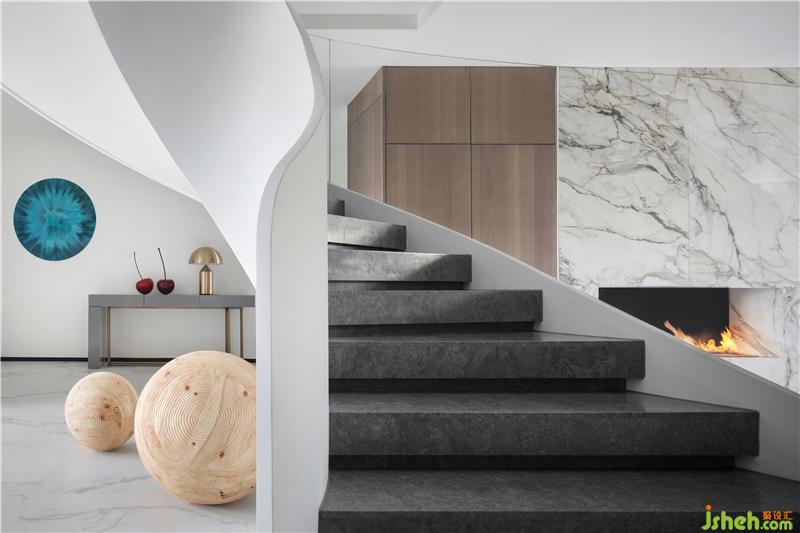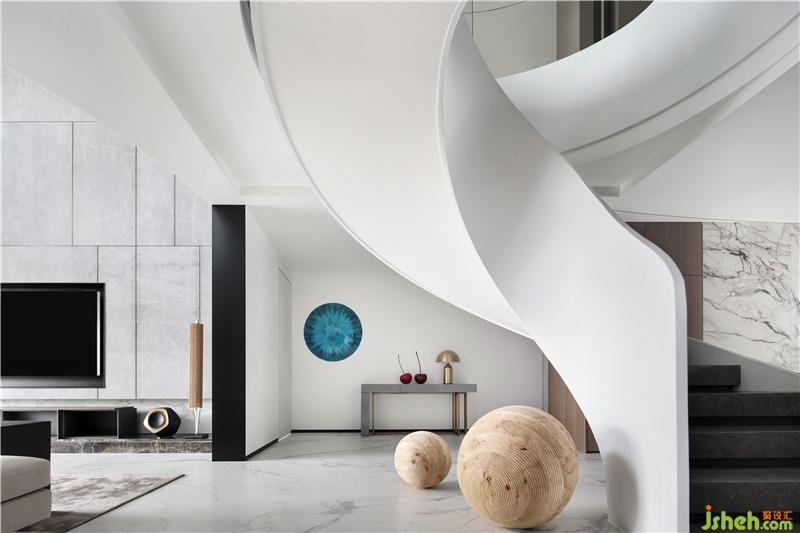 設(shè)計師將樓梯的位置移到客廳正中心,在原有挑空的基礎(chǔ)上進(jìn)行了合理搭建。讓樓梯成為一首優(yōu)雅流動的美妙樂章中的最美和弦,視覺上充滿藝術(shù)的沖擊力與感染力,結(jié)構(gòu)上又真正起到了樞紐的作用。