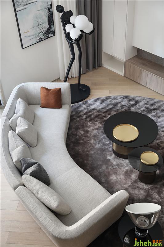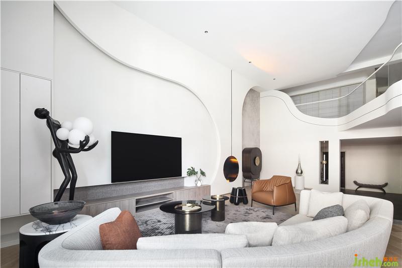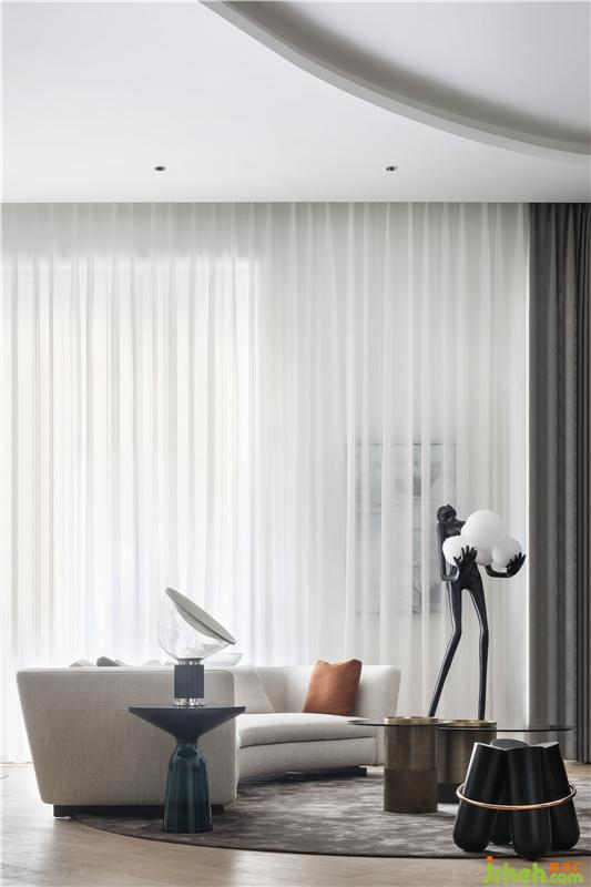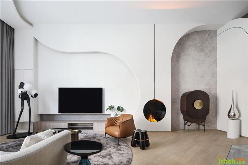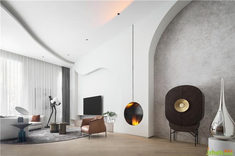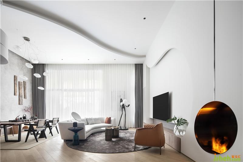 空間將曲線的幾種幾何類型表達(dá)得淋漓盡致,并將“曲”的精神氣質(zhì)貫穿始終,將圓弧線的飽滿與穩(wěn)定,橢圓線的擠壓與拉伸,拋物線的對稱與方向,雙曲線的平衡與流暢,自由曲線的隨意與自然,巧妙交織在一起,形成了相對的規(guī)則性、秩序性和穩(wěn)定性,就像重慶火鍋對各類食材的接受包容以及將其融于老油鍋底所產(chǎn)生的醇香和諧。 吊頂、壁爐、沙發(fā)、電視墻中的圓弧線設(shè)計,從形態(tài)上表現(xiàn)飽滿、穩(wěn)定的視覺效果??臻g以不同體量、相互交錯的平面圓弧為結(jié)構(gòu),實現(xiàn)了不同功能區(qū)域的劃分。走廊無規(guī)律的自由曲線形態(tài),充滿了飄動感與動人的詩意。各類曲線形態(tài)錯落串聯(lián),營造出優(yōu)雅、浪漫、溫婉的空間氛圍。