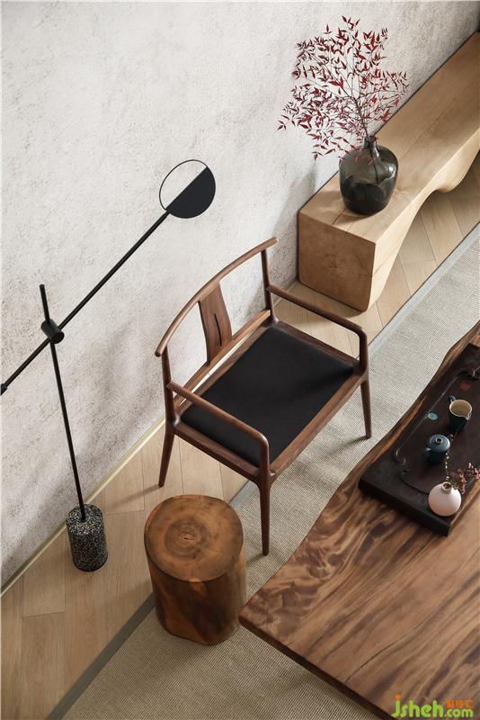 質(zhì)樸敦厚的木質(zhì)矮凳,體現(xiàn)著曲線的“豐潤”之美,盈缺有度,它將空間高度降低,進(jìn)一步營造出茶室視野的開闊。茶桌上的木紋漾開一道道曲線,肌理細(xì)膩自然。茶椅圓潤的扶手憑借良好的觸感讓人格外心安。 “心遠(yuǎn)地自偏”的清凈茶室,樸實無華,卻在喧鬧的現(xiàn)代城市生活中為人提供了一處慰藉心靈的“桃源”。