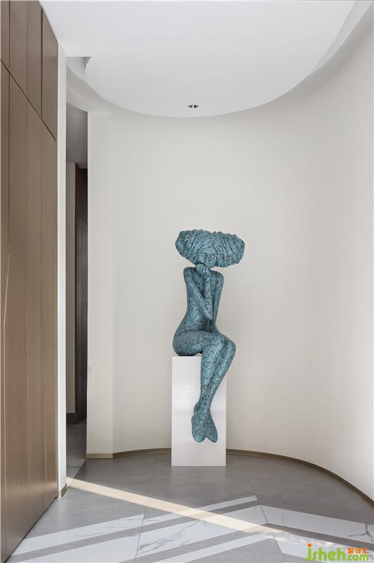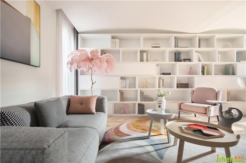 二樓家庭廳的弧度家具陳設(shè)既是對空間“曲”形態(tài)主題的呼應(yīng),又讓人感覺到舒適溫馨。明快的暖色調(diào),讓空間散發(fā)出一種放松感,充滿了愉悅的趣味。