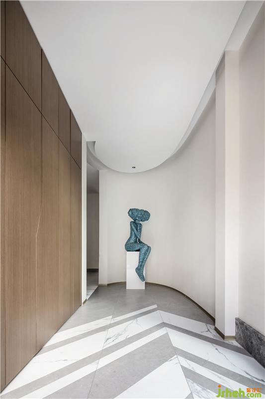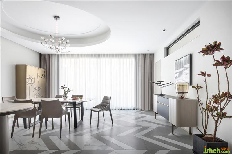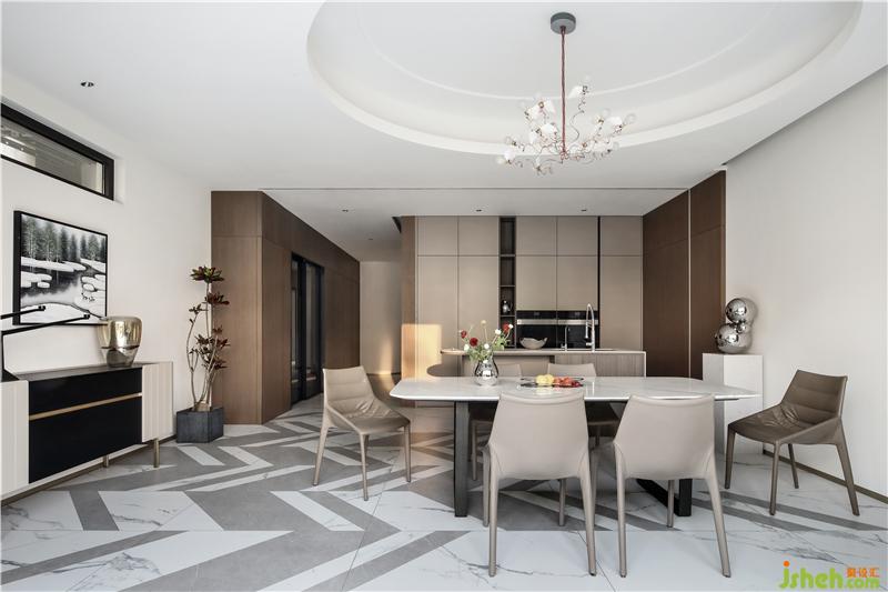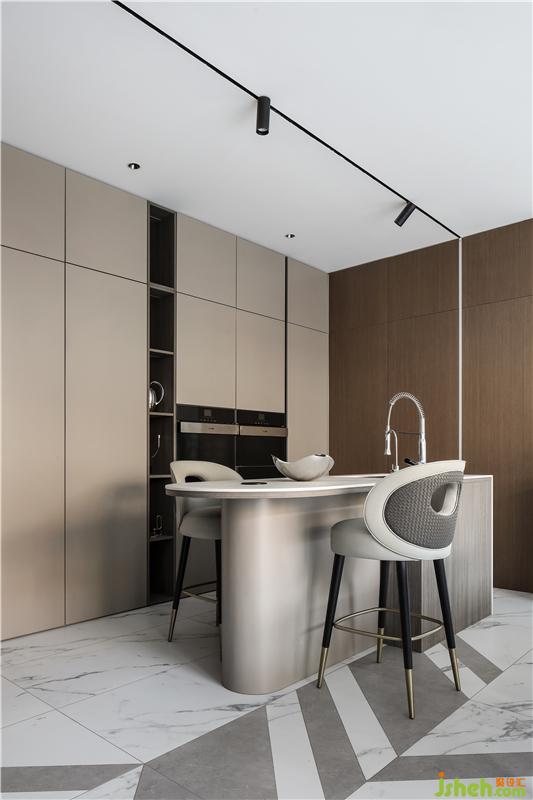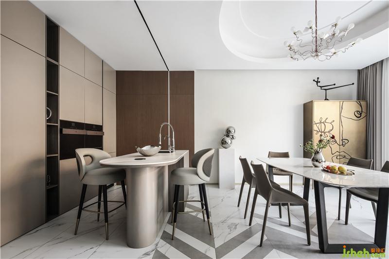 菱形地拼向內(nèi)延伸至餐廚空間,富于幾何造型的多變。相對規(guī)則、接近正圓的橢圓形的吊頂,與空間中的“方”元素,形成剛?cè)嵯酀?jì)的穩(wěn)定感與力度感,同時漫向四周的擴(kuò)張感,減弱了平面橫線造成的壓抑。讓空間更加收放自如。 收納有序、干凈利落的餐廚空間,將開放的西廚空間與封閉的中廚空間巧妙結(jié)合,兼顧西廚空間的日常社交與中廚空間的油煙隔離。西廚與餐廳之間是完全開敞的,島臺不僅可以洗菜備餐,更可以作為吧臺和臨時餐桌使用,它成為廚房的過度邊界,也是將廚房與生活相連的紐帶,可以隨時暢享休閑愜意的咖啡時光,還可以坐在這里與準(zhǔn)備美食的家人親密交流和互動。