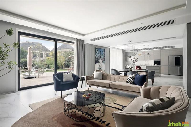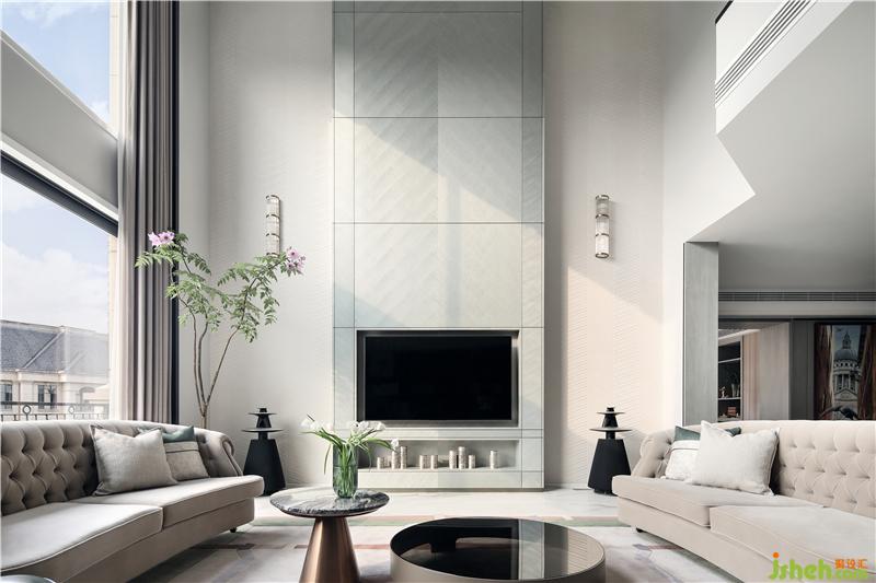 位于一樓的客廳汲取古典對(duì)稱之美,打造出屬于自己的空間秩序。高大的落地玻璃窗,將自然光線一覽無遺地引入到室內(nèi),使室內(nèi)可以酣暢沐浴自然光線的饋贈(zèng),高大開敞的空間格局,讓處在其中的人也獲得了一種開闊爽朗的心境。