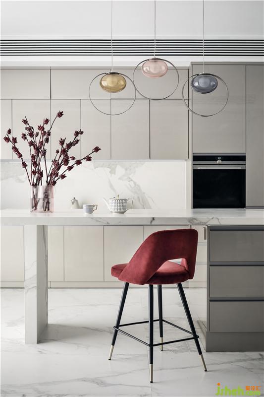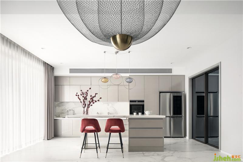 整個(gè)項(xiàng)目的施工落地進(jìn)行了三年之久。設(shè)計(jì)師對(duì)空間進(jìn)行了合理的優(yōu)化與改造,將清雅別致的家庭廳與簡(jiǎn)潔明快的西廚貫通一體,大氣舒朗。自然光從門外肆意灑落進(jìn)來,更增室內(nèi)的開闊通透之感。墻上掛畫藝術(shù)品來自王念東的《Hello City》,勾勒女性的自然線條,為空間添以藝術(shù)筆觸。
