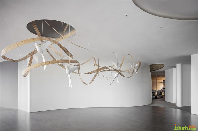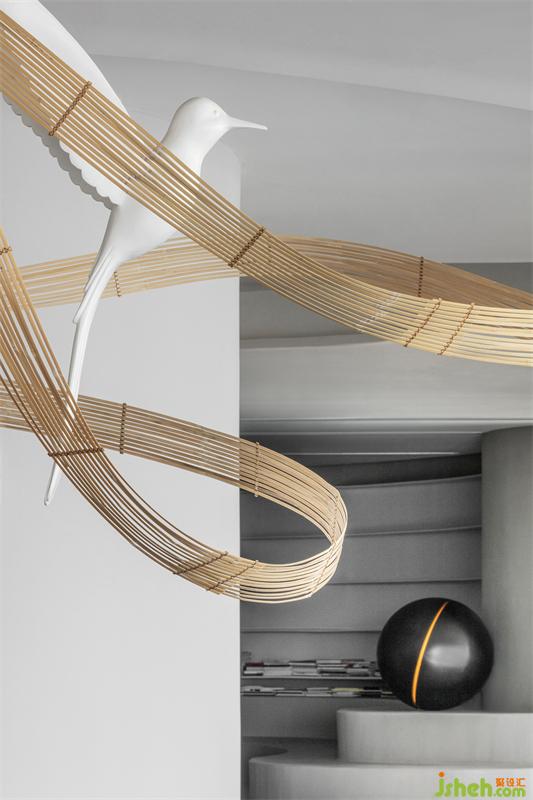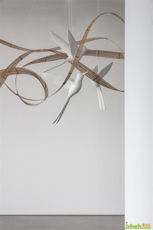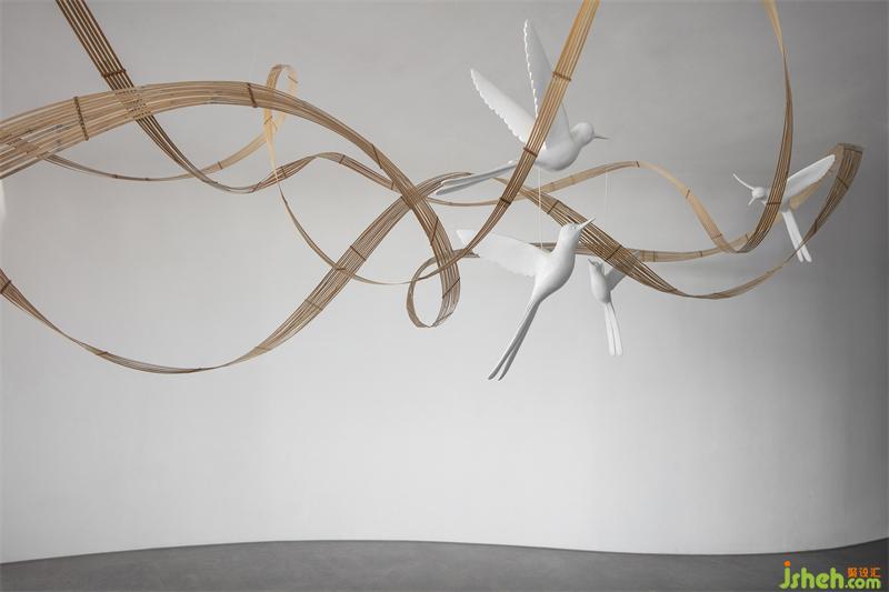 輕盈的竹編描繪出柔美的曲線,與輕快奮飛的飛鳥(niǎo),在白色墻幕的原始肌理之下,空寂而純粹,不著一物,傍無(wú)所依,卻詩(shī)韻畢現(xiàn)。