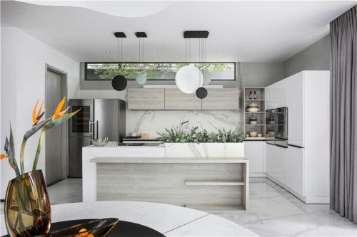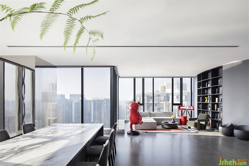 不同于傳統(tǒng)辦公空間將餐廚空間作為次要空間的一貫布局,新辦公區(qū)設(shè)計(jì)借吸納了西方餐廚空間的社交開(kāi)放文化,餐廚空間同樣視野極佳,餐桌與島臺(tái)相連,長(zhǎng)達(dá)7米,使得空間的縱深感進(jìn)一步延伸,顯得更為大氣朗闊,除了作為日常的項(xiàng)目方案溝通會(huì)議區(qū)外,這里還可作為休閑社交的沙龍分享區(qū)、私宴宴請(qǐng)區(qū)。