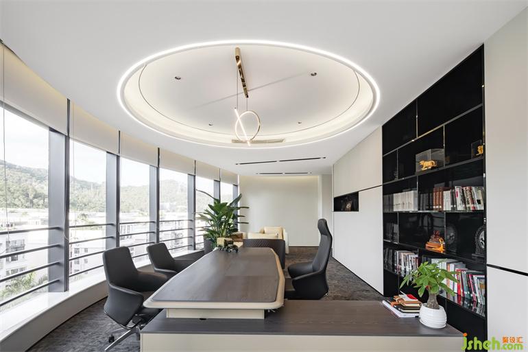獨(dú)立辦公室的建筑空間是異形,因勢(shì)利導(dǎo),以最寬位置的圓形天花做為空間主導(dǎo),兩邊的斜向線條均衡了空間感。