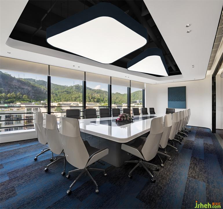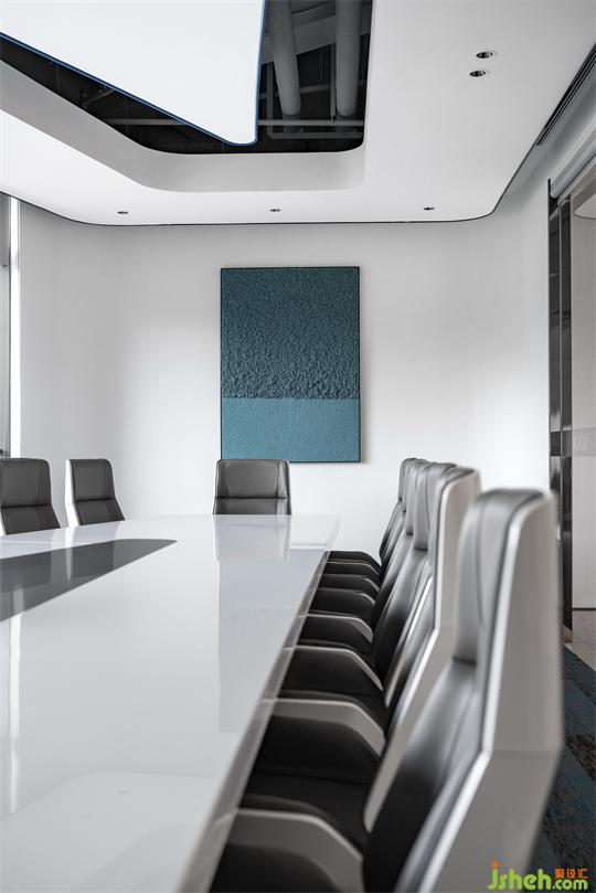 中型會(huì)議室利用了斜向空間的造型特點(diǎn)做梯形的天花做法。創(chuàng)造性的用兩組異形的發(fā)光燈片,巧妙布局、時(shí)尚酷炫。