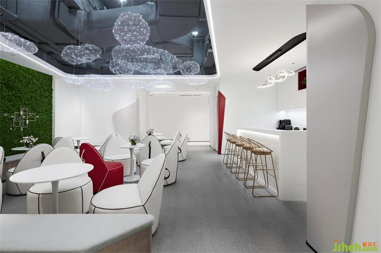 休閑空間為整個(gè)空間的中心樞紐,空間四通八達(dá),連接接待區(qū)、辦公區(qū)、會(huì)議區(qū)。設(shè)計(jì)用不規(guī)則的四邊形構(gòu)建了空間維度。營(yíng)造活潑生動(dòng)的空間感。