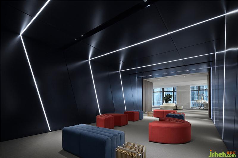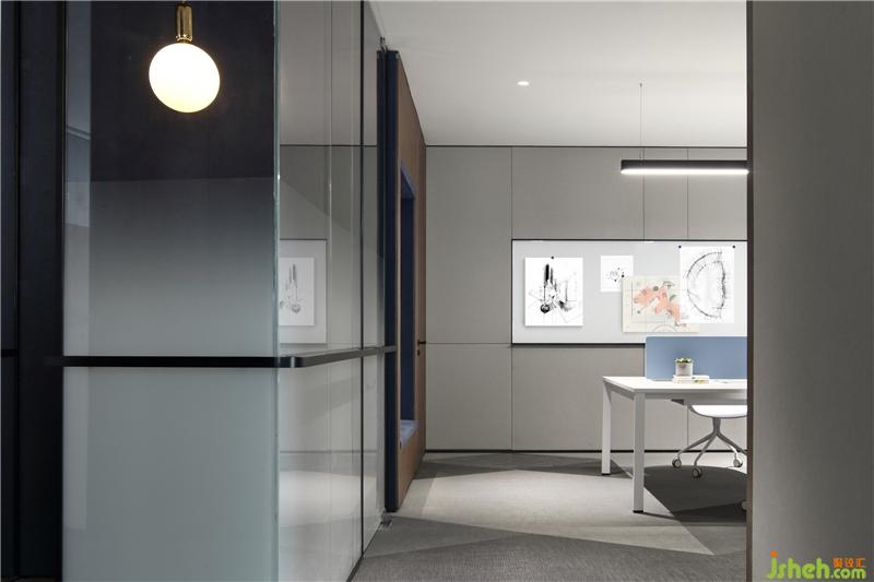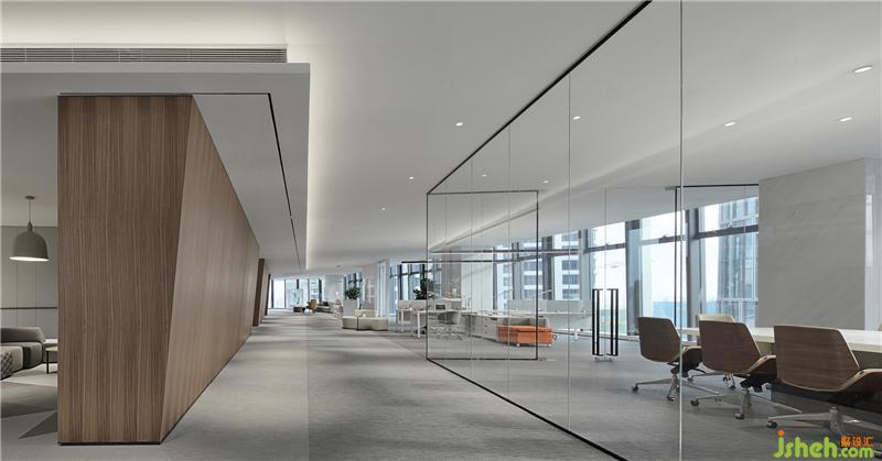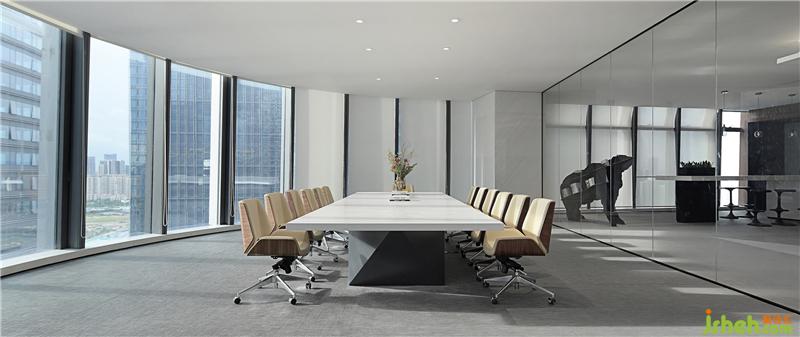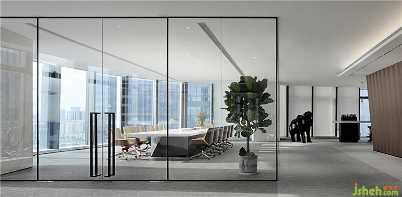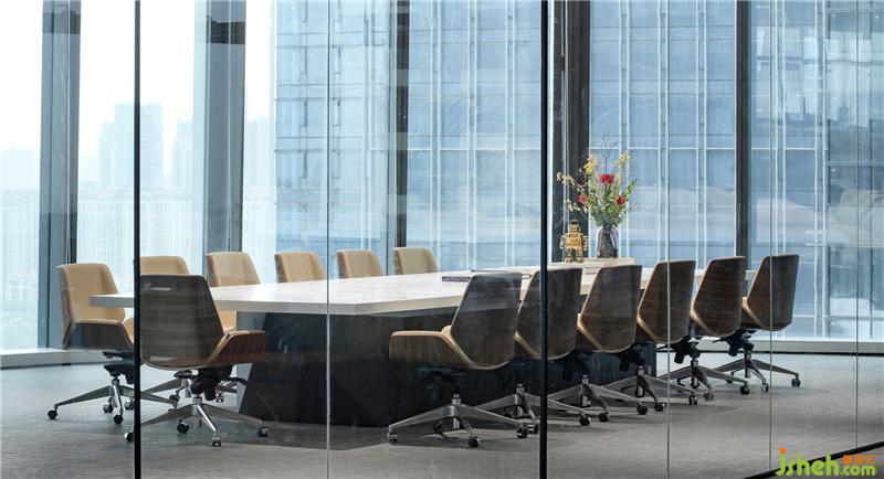 大面積玻璃代替厚重墻體,輕薄的線條邊框隱匿其中,共享會(huì)議室的物理分區(qū)體量被減至最小。“透明盒子”的結(jié)構(gòu)被光線打通,一個(gè)高端質(zhì)感迭代空間內(nèi),空間與工作發(fā)生緊密而富有無(wú)盡創(chuàng)造力的未來(lái)。裝修設(shè)計(jì)