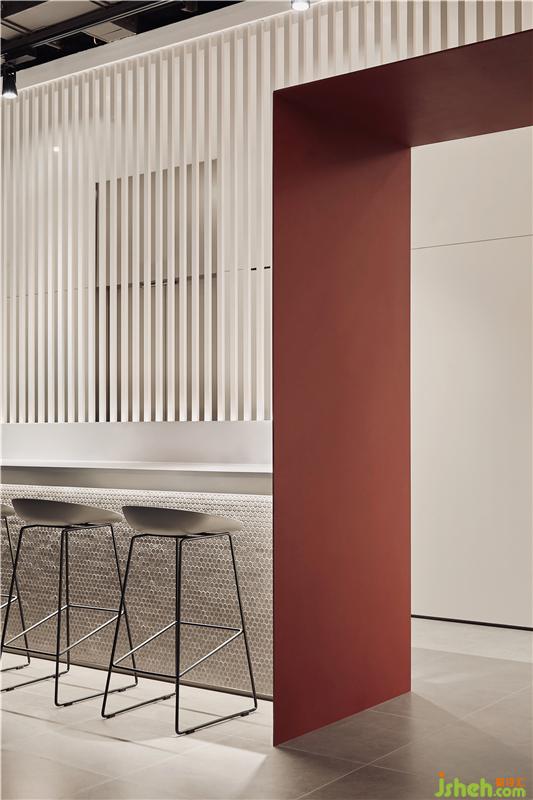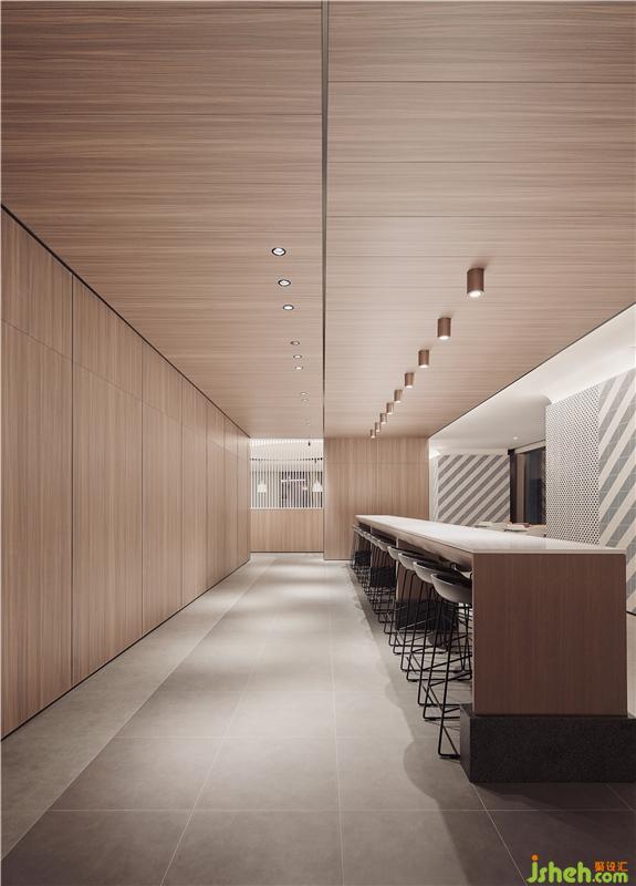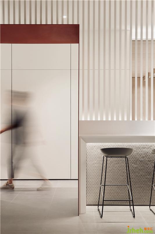 為了凸顯空間布局轉(zhuǎn)換,設(shè)計師采用大面積木飾面融入。自然的色調(diào)點綴出灰白對立的線條空間冷靜的溫度,在高冷基調(diào)中成為了融合而跳躍的存在。
