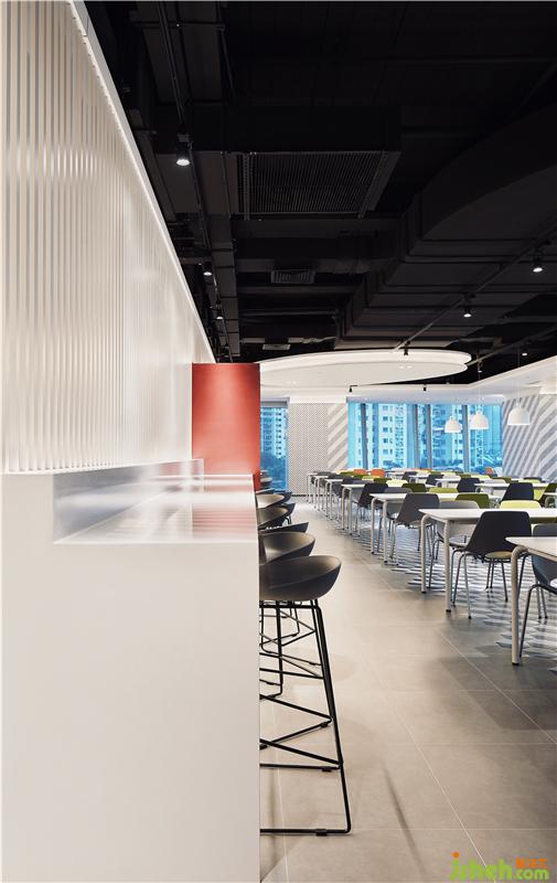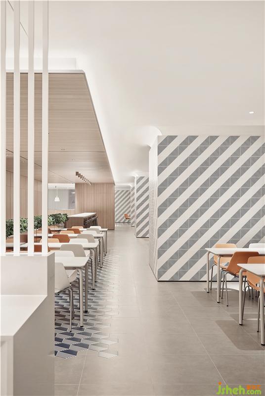平面構(gòu)成的元素弱化了原有柱網(wǎng)的體量,在空間中形成了隔而不透的裝飾墻的效果。序列感的線條與活潑的基調(diào)并沒有自亂陣腳,反而萌發(fā)出微妙的契合。餐廳設(shè)計