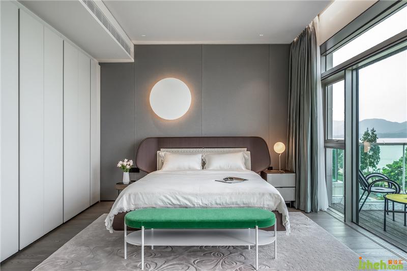 該空間設(shè)有8米寬超大全景落地窗,香港別墅裝飾海景風(fēng)光盡收眼底,為主人增添分外的生活情調(diào)。臥室、陽臺(tái)與室外空間,通過一個(gè)開敞透明的玻璃門形成良好的空間分割又完美融合在一起。