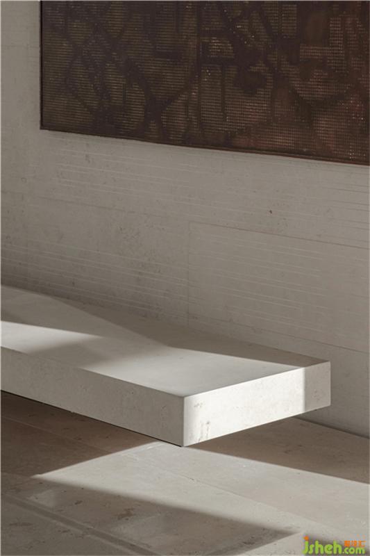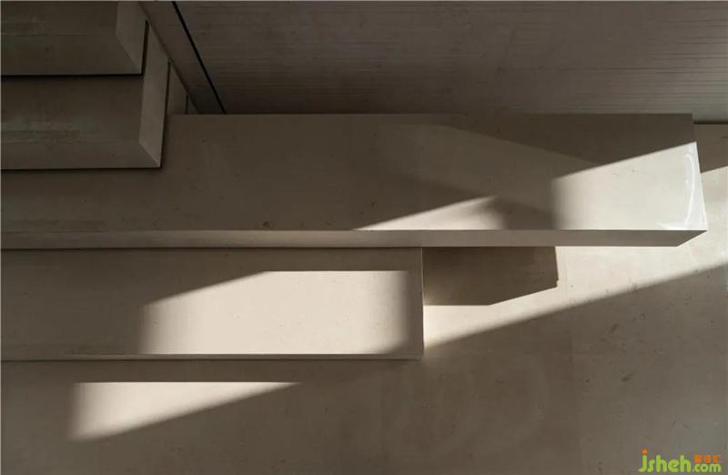 當(dāng)體塊與幾何、線條交疊出造型規(guī)律,樓梯場(chǎng)域不再只是作為功能而使用,更成為藝術(shù)轉(zhuǎn)場(chǎng)、美學(xué)過(guò)渡的一種裝置。與淺米色結(jié)構(gòu)相對(duì)的,是一幅暗色調(diào)的金屬蝕刻掛畫(huà),上面抽象地描繪了天津的地圖,寫(xiě)意一種藏在舊時(shí)光里的秘密沉淀。