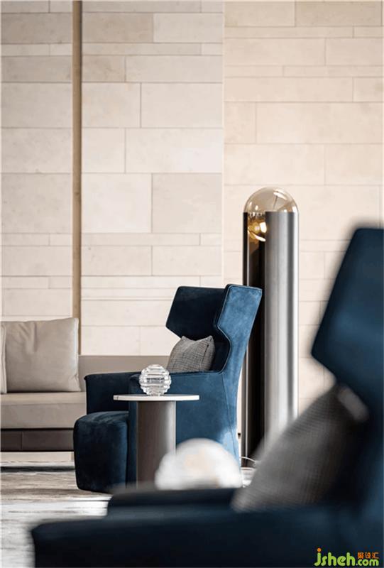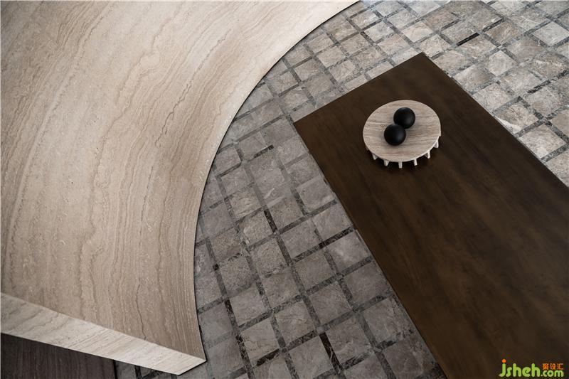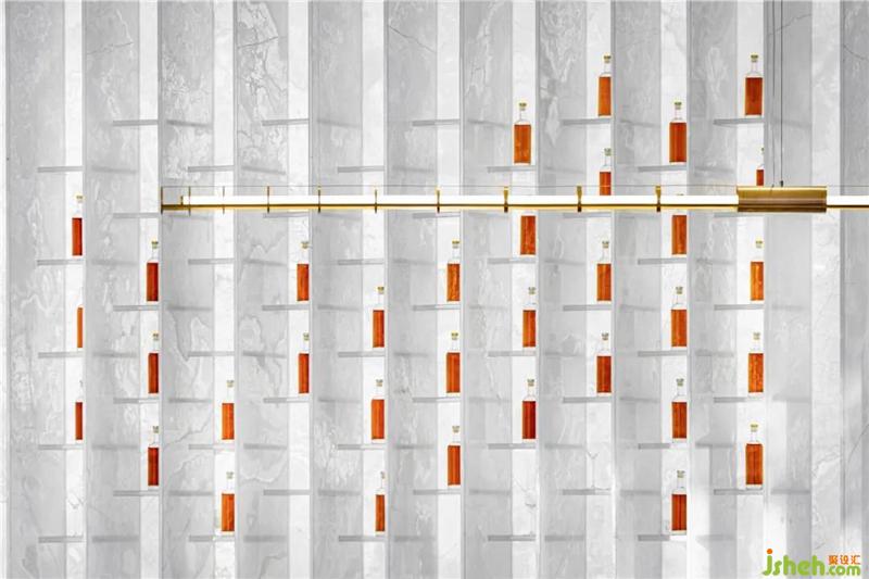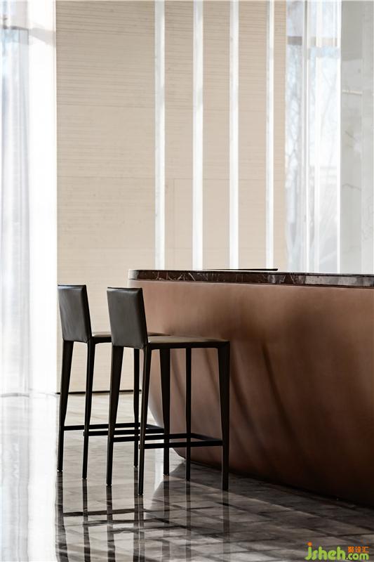 幾何的面、線條的線,在空間之中交錯、對比,達到美學平衡層面的曲直比例。玉石隔斷的有序陣列結(jié)構(gòu),延續(xù)至水吧,成為背景墻與酒架合一的功能體。水吧臺的設計,以液態(tài)金屬漆一體成型,加之紫羅紅大理石的碰撞,構(gòu)建出漂浮的船形輪廓,予人一種擺脫繁雜的視覺感受。