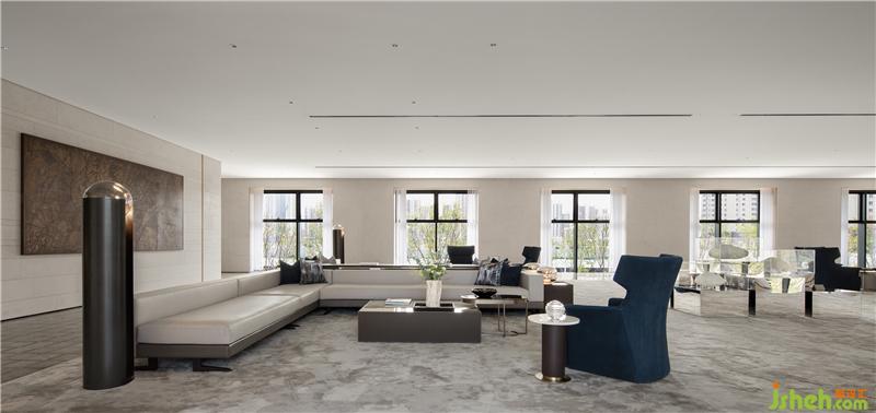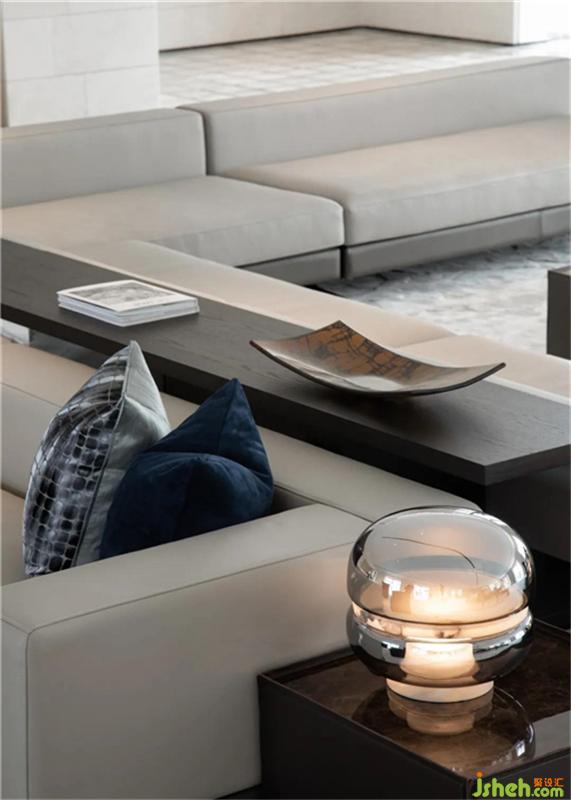 空間轉(zhuǎn)由雅灰布藝沙發(fā)、做舊黃銅書架、抽象蝕刻掛畫、極簡燈飾等組成的軟裝創(chuàng)想來呈現(xiàn),在情感與現(xiàn)代文明中找到平衡點。