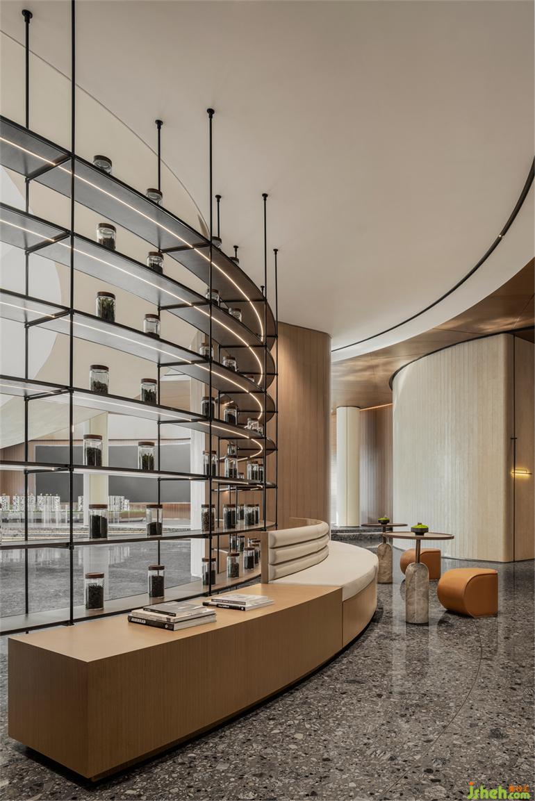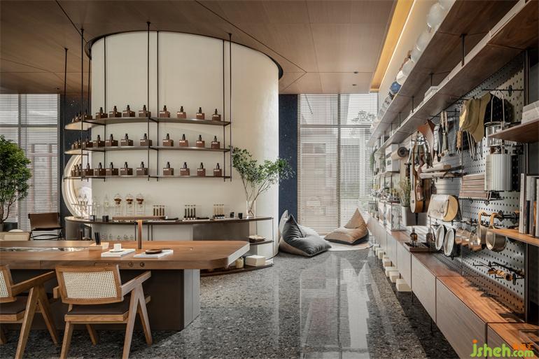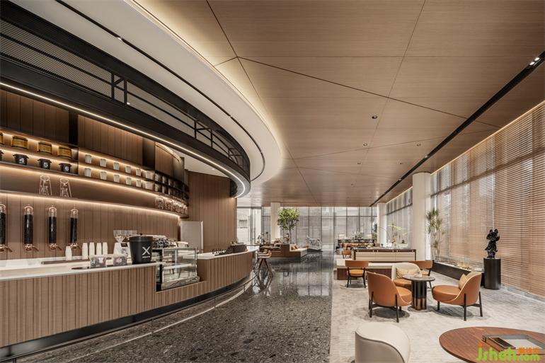 在咖啡&茶吧中,柔和與濃醇味覺相遇。廣州售樓處設計操作臺暗藏在圓形圍合式臺面中,木飾面與金屬框架折射香氣與燈光,環(huán)境視覺主打暖意縱生的社交自由感。