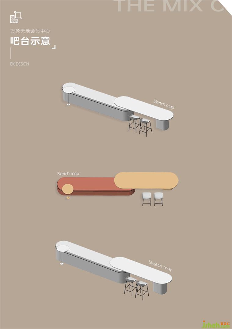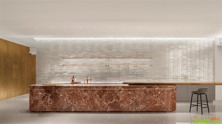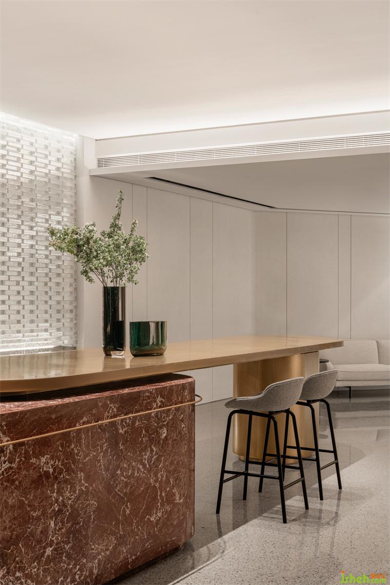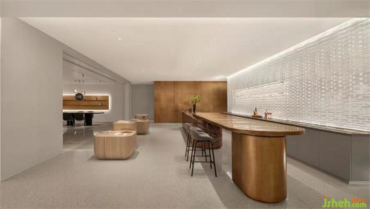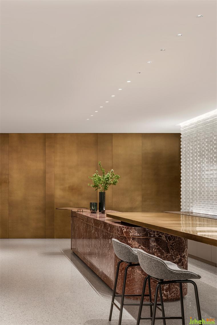 我們將主體大空間視覺用“體塊感”的概念統(tǒng)領(lǐng)。每個(gè)體塊由黃銅、裝修設(shè)計(jì)玻璃磚等“盒子”渲染圍合,不同的功能區(qū)對應(yīng)不同的基礎(chǔ)方塊,同時(shí)順延客戶的行進(jìn)動線,層層遞進(jìn)。