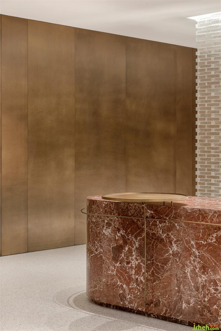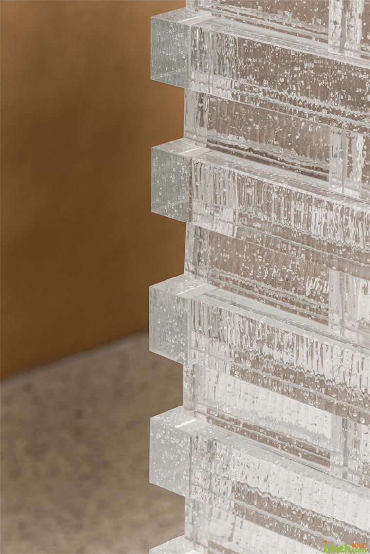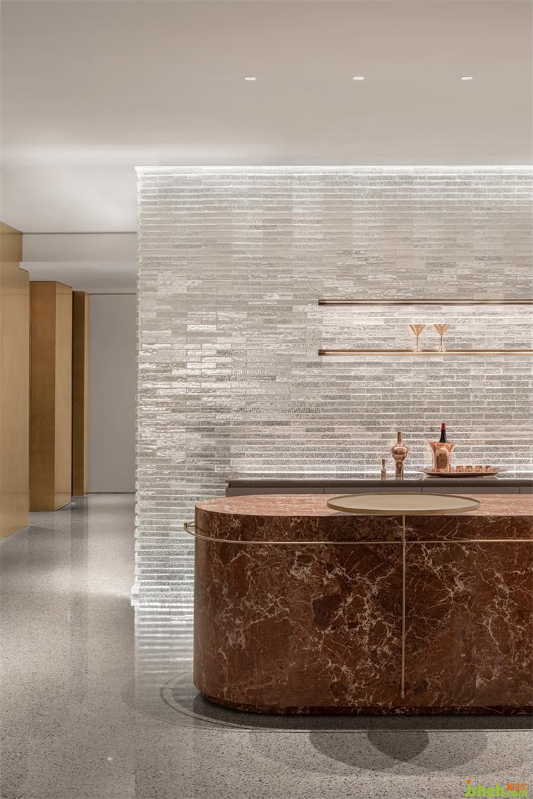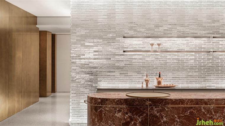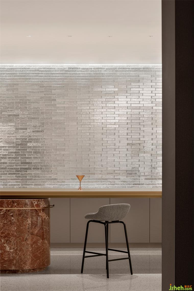 為了突破全室內(nèi)的封閉感,入口迎賓及吧臺背景墻利用玻璃磚層疊排布形成光的棱鏡效果,裝修設(shè)計(jì)若隱若現(xiàn)的剪影透射而出,隱而不盲、藏而不喧。