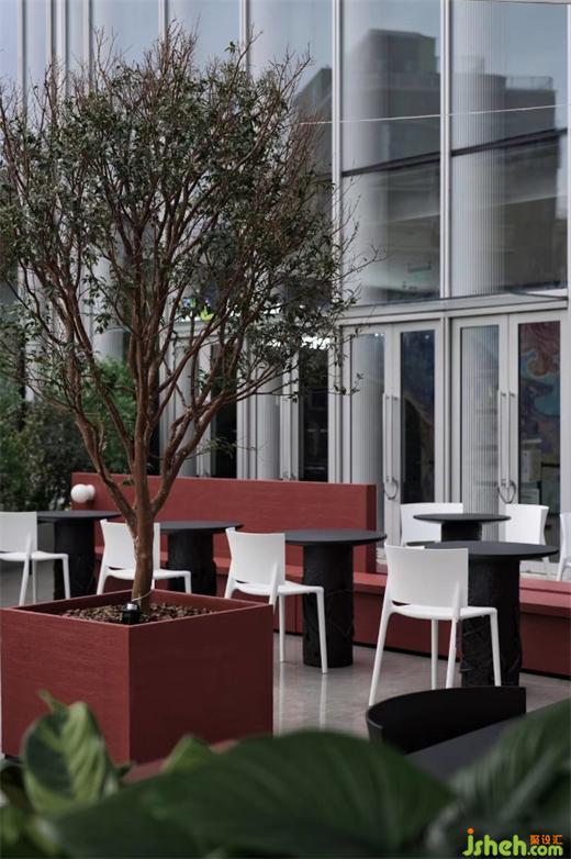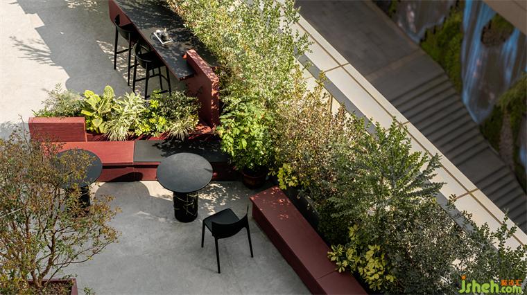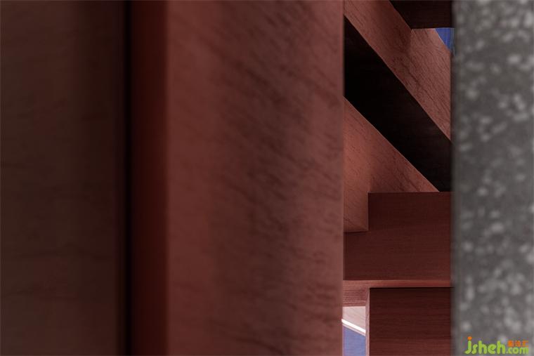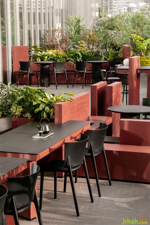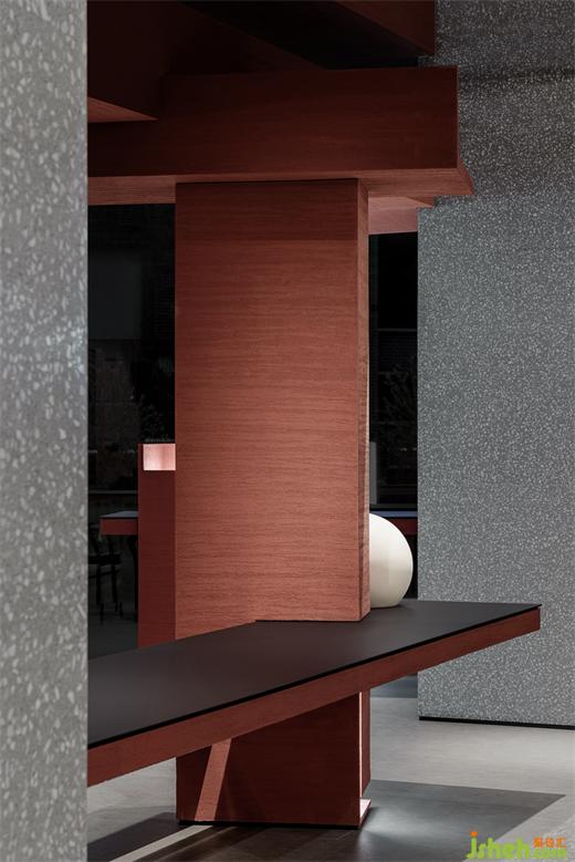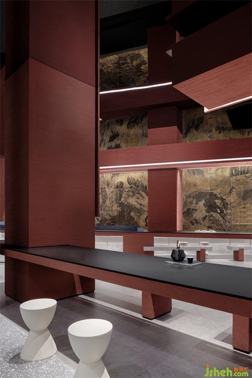 風(fēng)化紅壤土斑駁的紋理充滿歲月古老的粗糙感,從觸感、觀感都完美復(fù)刻了土壤的風(fēng)化斷層面。茶樓設(shè)計(jì)火山黑巖板與之形成意象色彩沖突,重現(xiàn)著古老的自然演化過(guò)程。