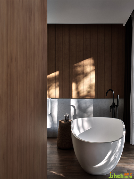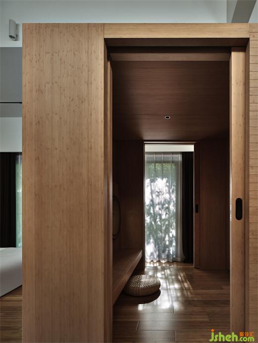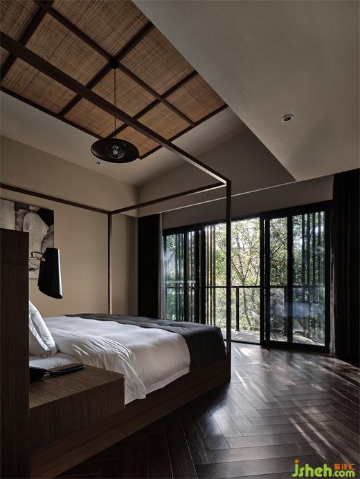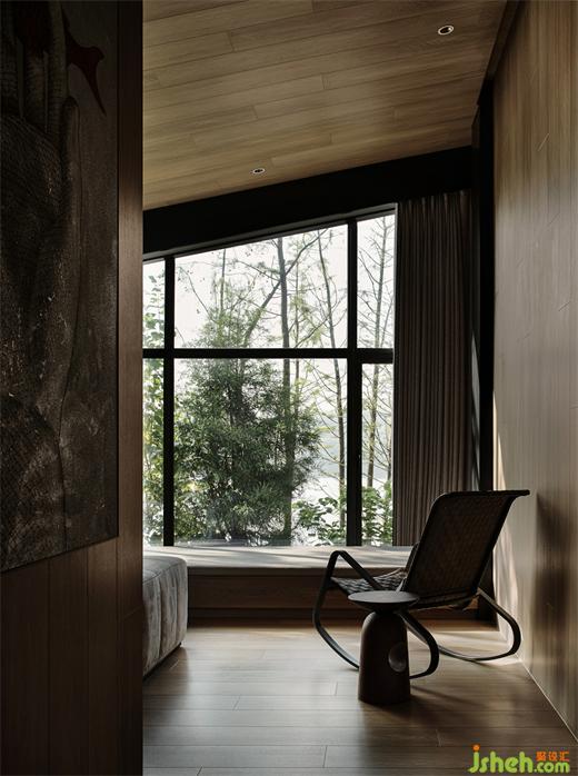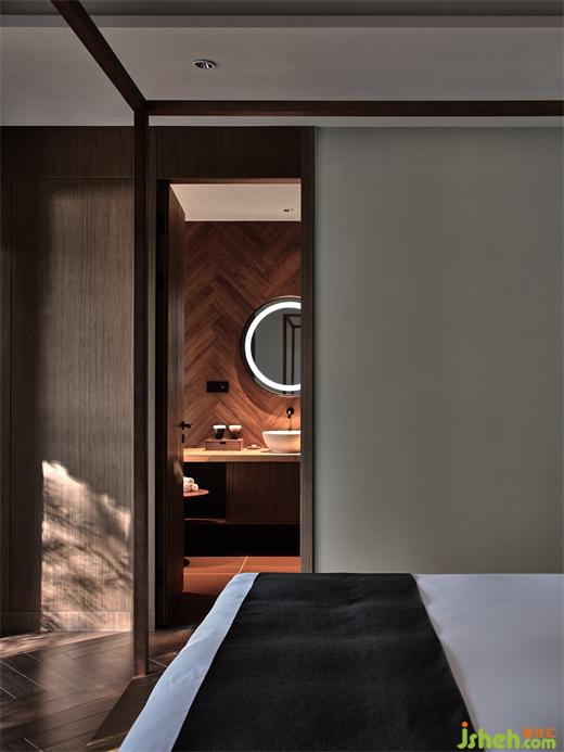 在莊園酒店設(shè)計(jì)師看來,建筑物與環(huán)境的和諧,從對在地性的思辨、挖掘與運(yùn)用開始,這也是回歸自然的第一步。竹林雅居單臥院落以榻榻米的構(gòu)造,形成了日式風(fēng)格的旅居小屋,竹木貫穿于天地墻的造型中。一線天窗打開空間的自然視野,設(shè)計(jì)師在空間內(nèi)置入原木色的盒子體塊,再造層次感,與斑駁樹影相映成趣。