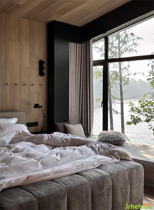 一扇窗臺即一幅景框,與湖面遠(yuǎn)遠(yuǎn)疊為一個(gè)詩意畫面,戶外自然之美,頗有詩句里“堂開團(tuán)竹色,窗靜引送風(fēng)”的意境。