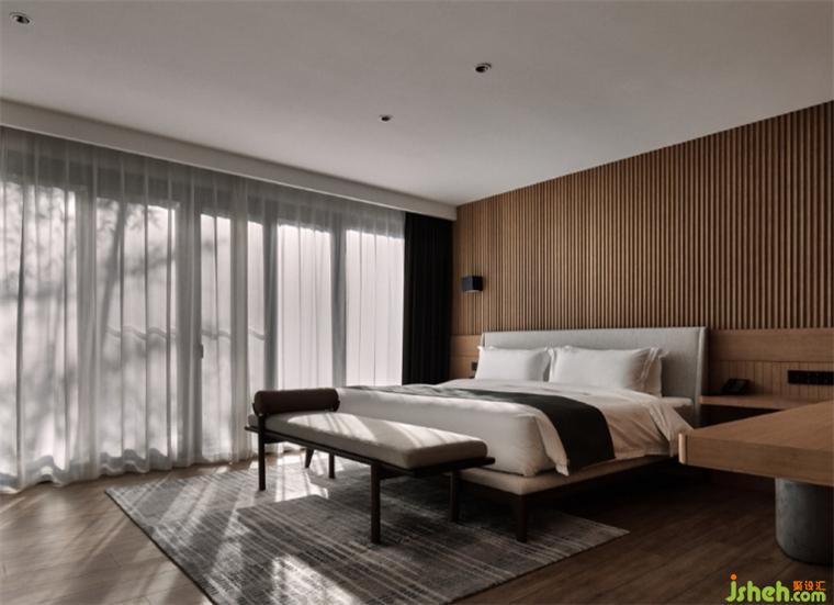 經(jīng)由當(dāng)代筆法簡化的屋脊造型,保留了原始建筑的自然野性,同時設(shè)計師采用原木元素橫梁和肌理漆,加之素白墻面的凹凸顆粒感,調(diào)和空間場景的質(zhì)樸氣質(zhì)。全莊園房型中僅此一個的壁爐設(shè)計,納藏野趣,讓人在圍爐取暖中開啟酣夢。