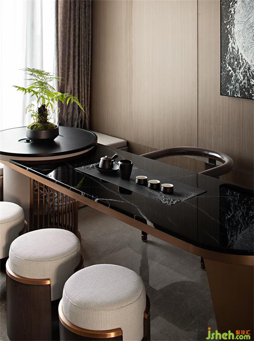 自然光引入室內,通透而舒展。器物收藏,悉數盡顯,樣板房設計肆意生長的綠植給靜謐的空間輕抹一份清新靈動的情緒氛圍。