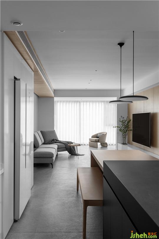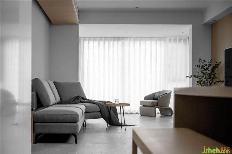 加長的空調風口,增強了客餐廳的連接性,也讓整個空間更具通透性。隨性而不隨意擺放的家具散落客廳與陽臺,和煦的陽光透進窗戶,隨著一天的時間有著深淺且細膩的變化。
