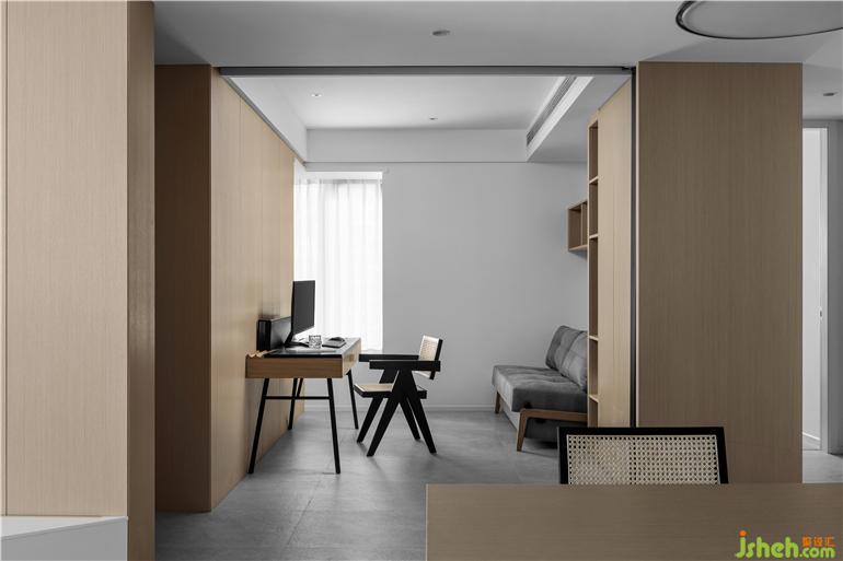 開放式的書房,沉溺在木色書香之中。為了盡量減少門洞的突兀,設計師把書房的門設計成嵌入式、主臥門做成隱形門。門外是人間煙火,門內是閑情雅致??勺兊拈_放式書房,人在工作時,也能隨時與廚房、客廳空間的家人交流,呈現了空間與空間的對話,讓家人之間的互動性和凝聚力更高