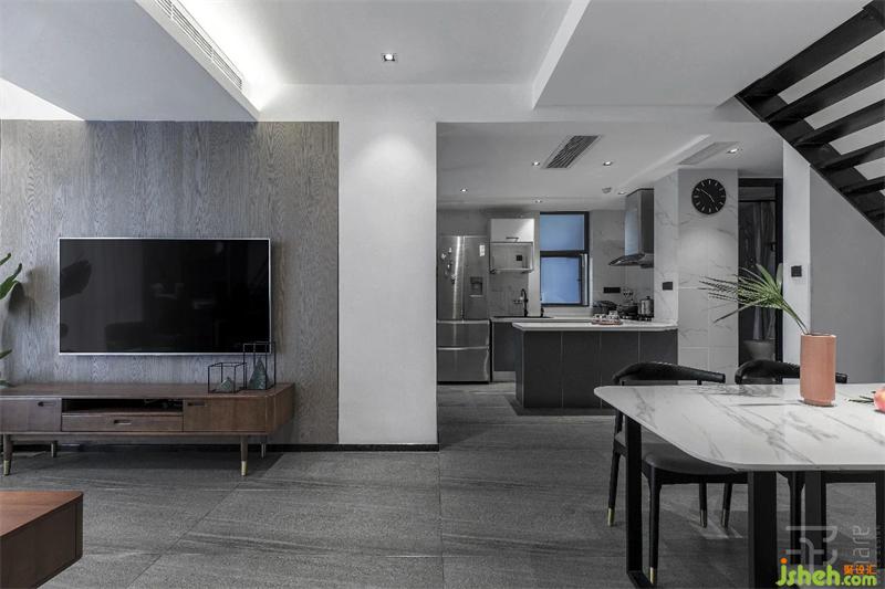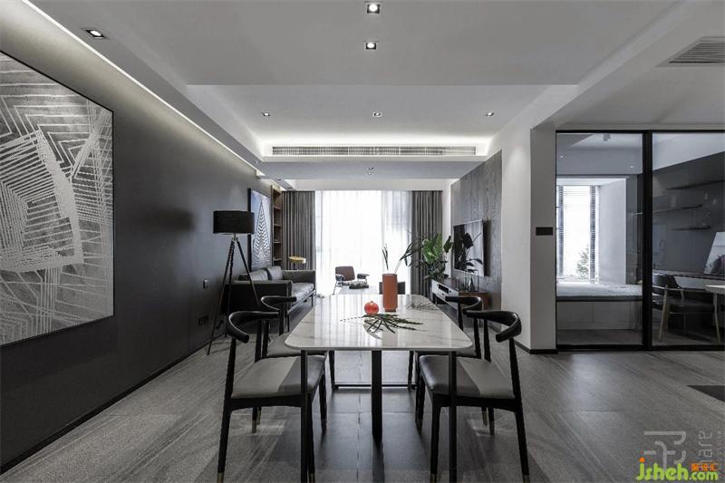 客廳空間定制的內(nèi)嵌格子柜,將空間利用率做到最大化。電視墻以木飾面板搭配乳膠漆,沙發(fā)背景墻一直延伸到餐廳的深灰色墻面,使客廳空間更加溫和內(nèi)斂。